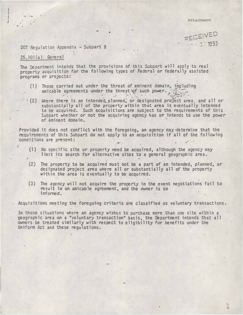 DOT regulation defining when federal property acquisition requirements apply, distinguishing between acquisitions under eminent domain threat and voluntary transactions. Outlines criteria for classifying acquisitions as voluntary when no specific site is required and negotiations may fail without eminent domain use.