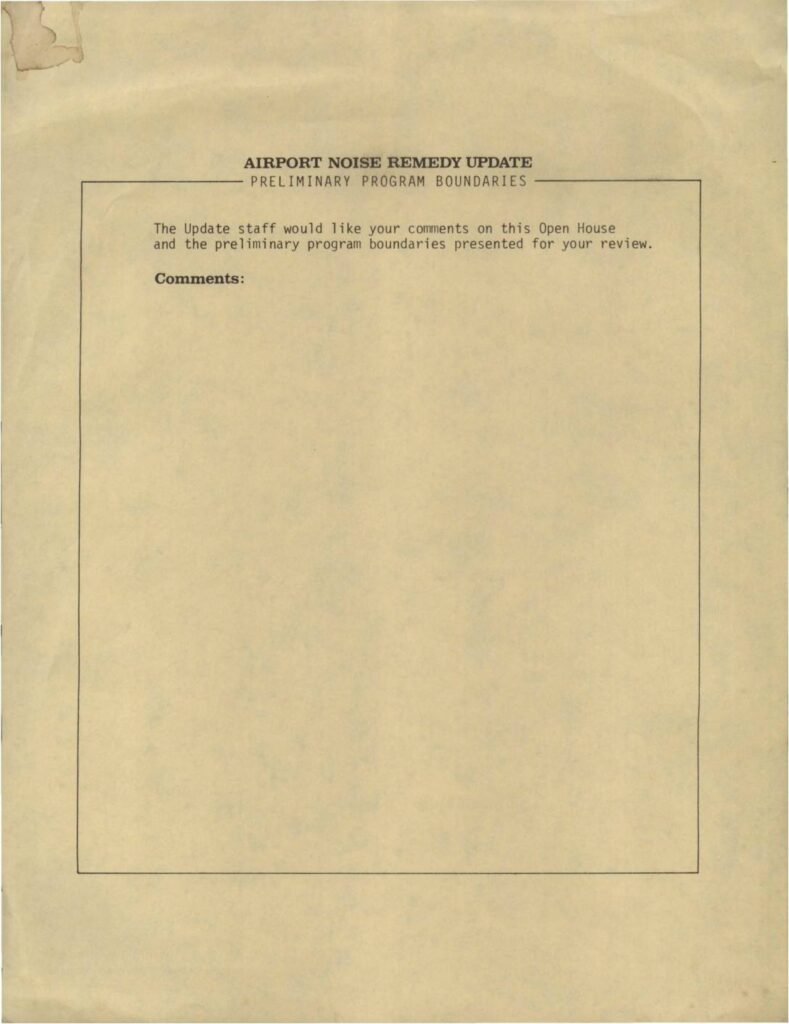 A comment form for an open house presentation regarding the Airport Noise Remedy Update program. The form requests public feedback on preliminary program boundaries presented for review.