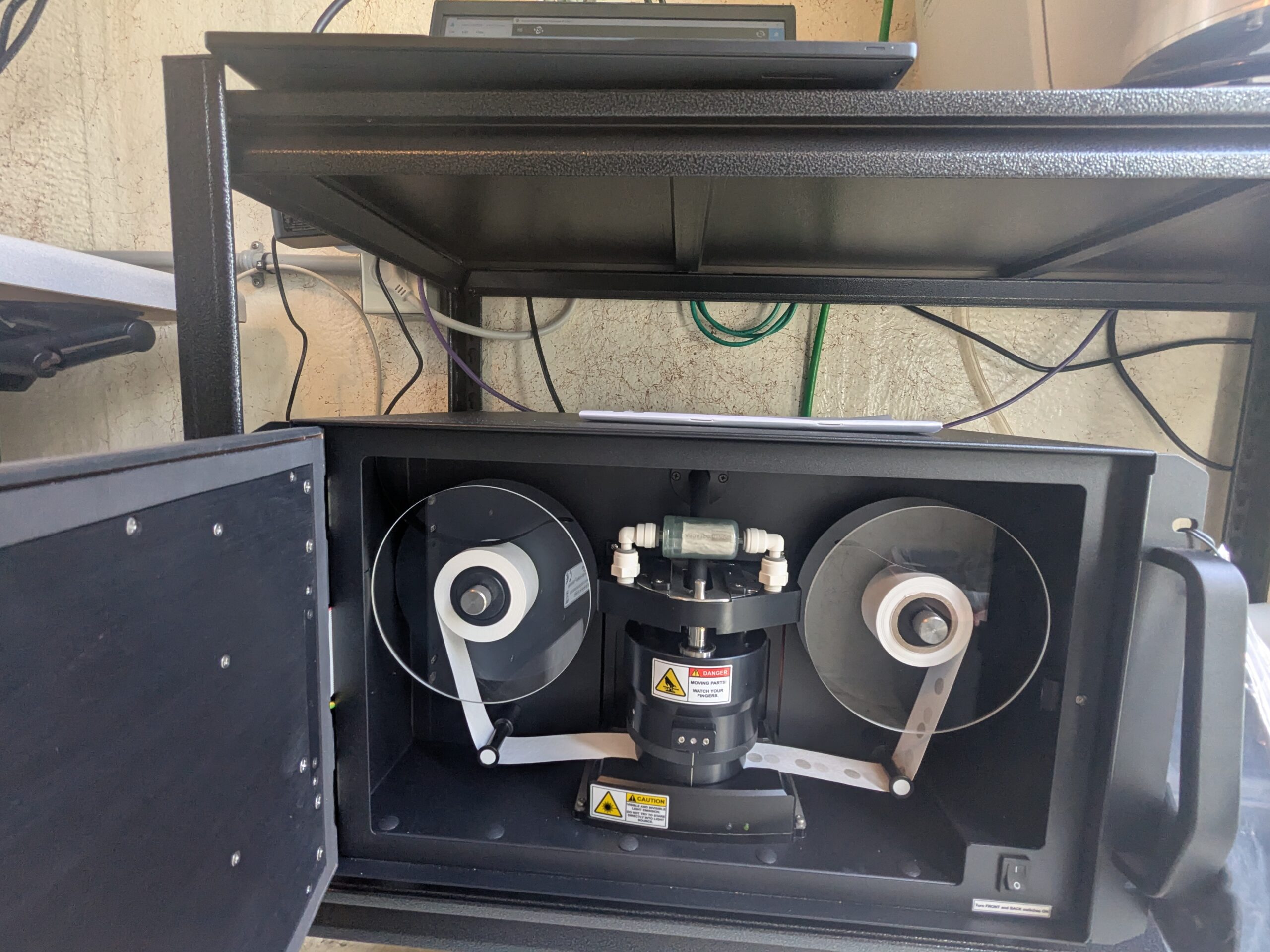 - Aethalometer (Black Carbon detector) Looking inside, you can see the old school ‘tape’ where each sample is collected.
