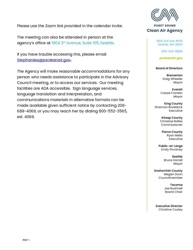 Advisory Council meeting agenda for January 14, 2026, including agenda items on climate action plan update, outdoor burning alternatives, and permitting processes. Also includes meeting minutes from September 10, 2025 with attendance records.