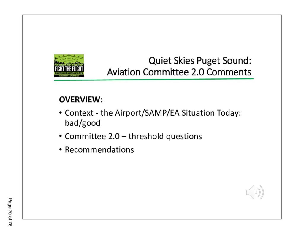 • Context - the Airport/SAMP/EA Situation Today: bad/good • Committee 2.0 – threshold questions • Recommendations Page 70 of 76 Quiet Skies Puget Sound: Aviation Committee 2.0 Comments Context: what’s bad • SAMP draft Environmental Assessment (EA): 87,000 more annual flights carry catastrophic public health consequences to children, elderly, social and environmental justice communities • EA – reflects 4600 pages of no meaningful Port collaboration or mitigation • EA evidences StART, Highline Forum are “box checks” as far as airport expansion concerned • To observers, not clear council on same page as to gravity of the impacts of airport expansion on our public health and environment. Page 71 of 76 Quiet Skies Puget Sound: Aviation Committee 2.0 Comments Context: what’s good • Opposition to SAMP lining up – EPA, cities, growing number of advocacy groups • Federal representative Adam Smith’s office • State level • District Senators, Reps historically terrific • Growing numbers of advocacy groups engaged • Legal/regulatory framework positive for push back • FAA outdated science regulations being questioned Page 72 of 76 Quiet Skies Puget Sound: Aviation Committee 2.0 Comments Threshold Questions Framing Committee 2.0 • Question #1: Does City believe the available science and studies have established the public health harms from aviation noise and pollution? • Question #2: Based on SAMP EA, do we all agree there is no remaining evidence-based reason to believe the Port will voluntarily limit its own expansion, even knowing of these harms to public health? • Question #3: Will this…