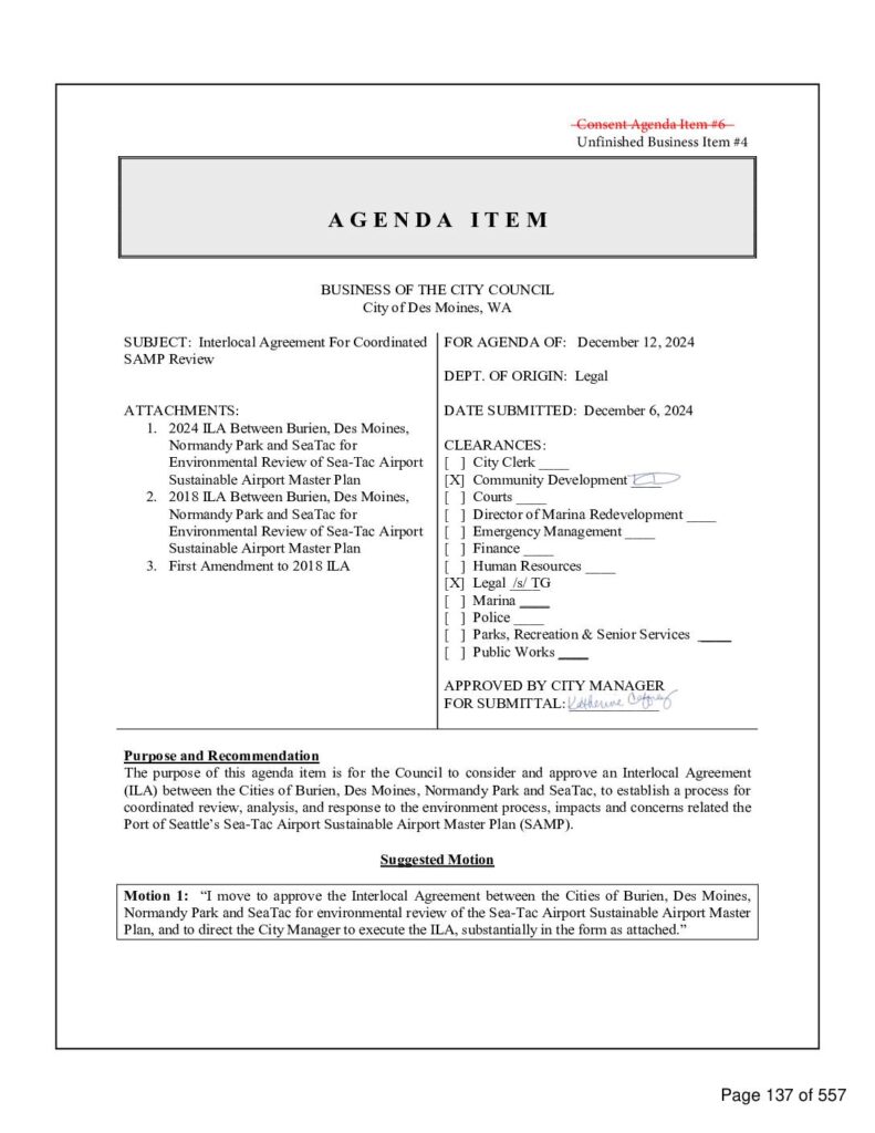 1. 2024 ILA Between Burien, Des Moines, Normandy Park and SeaTac for Environmental Review of Sea-Tac Airport Sustainable Airport Master Plan 2. 2018 ILA Between Burien, Des Moines, Normandy Park and SeaTac for Environmental Review of Sea-Tac Airport Sustainable Airport Master Plan 3. First Amendment to 2018 ILA FOR AGENDA OF: December 12, 2024 DEPT. OF ORIGIN: Legal DATE SUBMITTED: December 6, 2024 CLEARANCES: [ ] City Clerk ____ [X] Community Development ____ [ ] Courts ____ [ ] Director of Marina Redevelopment ____ [ ] Emergency Management ____ [ ] Finance ____ [ ] Human Resources ____ [X] Legal ____ [ ] Marina ____ [ ] Police ____ [ ] Parks, Recreation & Senior Services ____ [ ] Public Works ____ APPROVED BY CITY MANAGER FOR SUBMITTAL: ____________ Purpose and Recommendation The purpose of this agenda item is for the Council to consider and approve an Interlocal Agreement (ILA) between the Cities of Burien, Des Moines, Normandy Park and SeaTac, to establish a process for coordinated review, analysis, and response to the environment process, impacts and concerns related the Port of Seattle’s Sea-Tac Airport Sustainable Airport Master Plan (SAMP). Suggested Motion Motion 1: “I move to approve the Interlocal Agreement between the Cities of Burien, Des Moines, Normandy Park and SeaTac for environmental review of the Sea-Tac Airport Sustainable Airport Master Plan, and to direct the City Manager to execute the ILA, substantially in the form as attached.” /s/ TG Consent Agenda Item #6 Unfinished Business Item #4 ______________________…