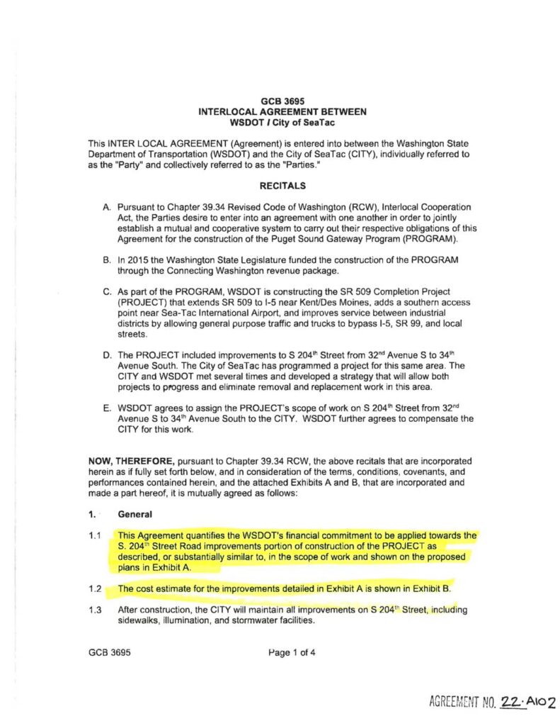 This INTER LOCAL AGREEMENT (Agreement) is entered into behveen the Washington State Department of Transportation (WSDOT) and the City of SeaTac (CITY), individually referred to as the "Party" and collectively referred to as the "Parties." RECITALS A. Pursuant to Chapter 39.34 Revised Code of Washington (RCW), lnterlocal Cooperation Act, the Parties desire to enter into an agreement with one another in order to jointly establish a mutual and cooperative system to carry out their respective obligations of this Agreement for the construction of the Puget Sound Gateway Program (PROGRAM). B. ln 2015 the Washington State Legislature funded the construction of the PROGRAM through the Connecting Washington revenue package. C. As part of the PROGRAM, WSDOT is constructing the SR 509 Completion Project (PROJECT) that extends SR 509 to l-5 near KenUDes Moines, adds a southern access point near Sea-Tac lnternational Airport, and improves service between industrial districts by allowing general purpose traffic and trucks to bypass l-5, SR 99, and local streets. D. The PROJECT included improvements to S 204rh Street from 32nd Avenue S to 34rh Avenue South. The City of SeaTac has programmed a project for this same area. The CITY and WSDOT met several times and developed a strategy that will allow both projects to prcgress and eliminate removal and replacement work in this area. E. WSDOT agrees to assign the PROJECT's scope of work on S 204th Street from 32nd Avenue S to 34th Avenue South to the CITY. WSDOT further agrees to compensate the CITY…