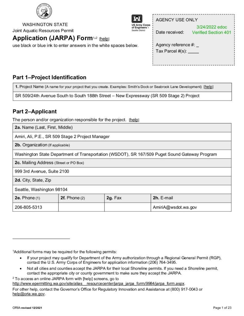 use black or blue ink to enter answers in the white spaces below. Part 1–Project Identification 1. Project Name (A name for your project that you create. Examples: Smith’s Dock or Seabrook Lane Development) [help] SR 509/24th Avenue South to South 188th Street – New Expressway (SR 509 Stage 2) Project Part 2–Applicant The person and/or organization responsible for the project. [help] 2a. Name (Last, First, Middle) Amiri, Ali, P.E., SR 509 Stage 2 Project Manager 2b. Organization (If applicable) Washington State Department of Transportation (WSDOT), SR 167/509 Puget Sound Gateway Program 2c. Mailing Address (Street or PO Box) 999 3rd Avenue, Suite 2100 2d. City, State, Zip Seattle, Washington 98104 2e. Phone (1) 2f. Phone (2) 2g. Fax 2h. E-mail 206-805-5313 AmiriA@wsdot.wa.gov 1Additional forms may be required for the following permits: • If your project may qualify for Department of the Army authorization through a Regional General Permit (RGP), contact the U.S. Army Corps of Engineers for application information (206) 764-3495. • Not all cities and counties accept the JARPA for their local Shoreline permits. If you need a Shoreline permit, contact the appropriate city or county government to make sure they accept the JARPA. To access an online JARPA form with [help] screens, go to http://www.epermitting.wa.gov/site/alias__resourcecenter/jarpa_jarpa_form/9984/jarpa_form.aspx. For other help, contact the Governor’s Office for Regulatory Innovation and Assistance at (800) 917-0043 or help@oria.wa.gov. AGENCY USE ONLY Date received: Agency reference #: Tax Parcel #(s): 3/24/2022 edoc Verified Section 401 http://www.bing.com/images/search?q=washington+state+seal&view=detailv2&qpvt=washington+state+seal&id=B01254F63F98016403555280BD9F8AF37E74F06D&selectedIndex=7&ccid=YCEifXXq&simid=607995554416365522&thid=OIP.M6021227d75ea02f3359b33a23b13cc55H2 http://ptjguidance.epermitting.wa.gov/DesktopModules/help.aspx?project=0&node=471 http://ptjguidance.epermitting.wa.gov/DesktopModules/help.aspx?project=0&node=547 http://ptjguidance.epermitting.wa.gov/DesktopModules/help.aspx?project=0&node=534 mailto:AmiriA@wsdot.wa.gov http://www.epermitting.wa.gov/site/alias__resourcecenter/jarpa_jarpa_form/9984/jarpa_form.aspx mailto:help@oria.wa.gov ORIA-revised 12/2021…
