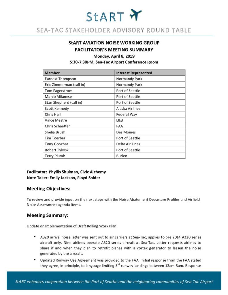 StART enhances cooperation between the Port of Seattle and the neighboring communities of Sea-Tac Airport StART AVIATION NOISE WORKING GROUP FACILITATOR’S MEETING SUMMARY Monday, April 8, 2019 5:30-7:30PM, Sea-Tac Airport Conference Room Member Interest Represented Earnest Thompson Normandy Park Eric Zimmerman (call in) Normandy Park Tom Fagerstrom Port of Seattle Marco Milanese Port of Seattle Stan Shepherd (call in) Port of Seattle Scott Kennedy Alaska Airlines Chris Hall Federal Way Vince Mestre L&B Chris Schaeffer FAA Shelia Brush Des Moines Tim Toerber Port of Seattle Tony Gonchar Delta Air Lines Robert Tykoski Port of Seattle Terry Plumb Burien Facilitator: Phyllis Shulman, Civic Alchemy Note Taker: Emily Jackson, Floyd Snider Meeting Objectives: To review and provide input on the next steps with the Noise Abatement Departure Profiles and Airfield Noise Assessment agenda items. Meeting Summary: Update on Implementation of Draft Rolling Work Plan • A320 arrival noise letter was sent out to air carriers at Sea-Tac; applies to pre 2014 A320 series aircraft only. Nine airlines operate A320 series aircraft at Sea-Tac. Letter requests airlines to share if and when they plan to retrofit planes with a vortex generator to lessen the noise generated by the aircraft. • Updated Runway Use Agreement was provided to the FAA. Initial response from the FAA stated they agree, in principle, to language limiting 3rd runway landings between 12am-5am. Response April 8, 2019 StART Facilitator’s Meeting Summary April 8, 2019 Page 2 included additional comments. Next steps include completing discussion and any revisions to language…