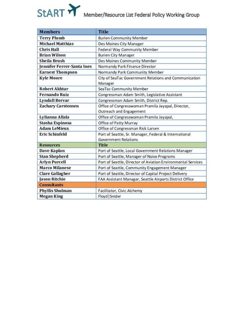 StART Member/Resource List Federal Policy Working Group Members Title Terry Plumb Burien Community Member Michael Matthias Des Moines City Manager Chris Hall Federal Way Community Member Brian Wilson Burien City Manager Sheila Brush Des Moines Community Member Jennifer Ferrer-Santa Ines Normandy Park Finance Director Earnest Thompson Normandy Park Community Member Kyle Moore City of SeaTac Government Relations and Communication Manager Robert Akhtar SeaTac Community Member Fernando Ruiz Congressman Adam Smith, Legislative Assistant Lyndall Bervar Congressman Adam Smith, District Rep. Zachary Carstensen Office of Congresswoman Pramila Jayapal, Director, Outreach and Engagement Lylianna Allala Office of Congresswoman Pramila Jayapal, Stasha Espinosa Office of Patty Murray Adam LeMieux Office of Congressman Rick Larsen Eric Schinfeld Port of Seattle, Sr. Manager, Federal & International Government Relations Resources Title Dave Kaplan Port of Seattle, Local Government Relations Manager Stan Shepherd Port of Seattle, Manager of Noise Programs Arlyn Purcell Port of Seattle, Director of Aviation Environmental Services Marco Milanese Port of Seattle, Community Engagement Manager Clare Gallagher Port of Seattle, Director of Capital Project Delivery Jason Ritchie FAA Assistant Manager, Seattle Airports District Office Consultants Phyllis Shulman Facilitator, Civic Alchemy Megan King Floyd|Snider