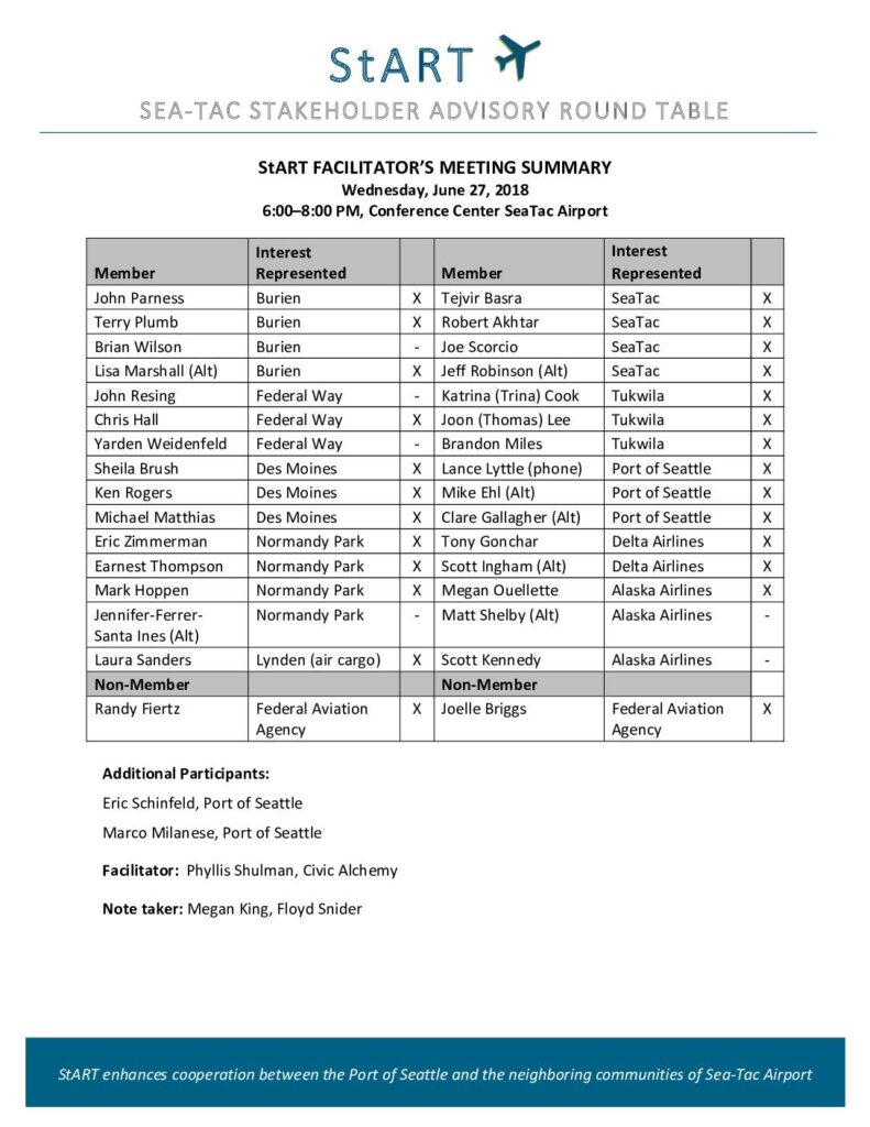StART enhances cooperation between the Port of Seattle and the neighboring communities of Sea-Tac Airport StART FACILITATOR’S MEETING SUMMARY Wednesday, June 27, 2018 6:00–8:00 PM, Conference Center SeaTac Airport Member Interest Represented Member Interest Represented John Parness Burien X Tejvir Basra SeaTac X Terry Plumb Burien X Robert Akhtar SeaTac X Brian Wilson Burien - Joe Scorcio SeaTac X Lisa Marshall (Alt) Burien X Jeff Robinson (Alt) SeaTac X John Resing Federal Way - Katrina (Trina) Cook Tukwila X Chris Hall Federal Way X Joon (Thomas) Lee Tukwila X Yarden Weidenfeld Federal Way - Brandon Miles Tukwila X Sheila Brush Des Moines X Lance Lyttle (phone) Port of Seattle X Ken Rogers Des Moines X Mike Ehl (Alt) Port of Seattle X Michael Matthias Des Moines X Clare Gallagher (Alt) Port of Seattle X Eric Zimmerman Normandy Park X Tony Gonchar Delta Airlines X Earnest Thompson Normandy Park X Scott Ingham (Alt) Delta Airlines X Mark Hoppen Normandy Park X Megan Ouellette Alaska Airlines X Jennifer-Ferrer- Santa Ines (Alt) Normandy Park - Matt Shelby (Alt) Alaska Airlines - Laura Sanders Lynden (air cargo) X Scott Kennedy Alaska Airlines - Non-Member Non-Member Randy Fiertz Federal Aviation Agency X Joelle Briggs Federal Aviation Agency X Additional Participants: Eric Schinfeld, Port of Seattle Marco Milanese, Port of Seattle Facilitator: Phyllis Shulman, Civic Alchemy Note taker: Megan King, Floyd Snider Final StART Facilitator’s Meeting Summary June 27, 2018 Page 2 Meeting Objectives: To discuss and prioritize a list of potential actions for StART to…
