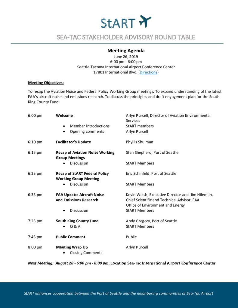 StART enhances cooperation between the Port of Seattle and the neighboring communities of Sea-Tac Airport Meeting Agenda June 26, 2019 6:00 pm - 8:00 pm Seattle-Tacoma International Airport Conference Center 17801 International Blvd. (Directions) Meeting Objectives: To recap the Aviation Noise and Federal Policy Working Group meetings. To expand understanding of the latest FAA’s aircraft noise and emissions research. To discuss the principles and draft engagement plan for the South King County Fund. 6:00 pm Welcome Arlyn Purcell, Director of Aviation Environmental Services • Member Introductions StART members • Opening comments Arlyn Purcell 6:10 pm Facilitator’s Update Phyllis Shulman 6:15 pm Recap of Aviation Noise Working Stan Shepherd, Port of Seattle Group Meetings • Discussion StART Members 6:25 pm Recap of StART Federal Policy Eric Schinfeld, Port of Seattle Working Group Meeting • Discussion StART Members 6:35 pm FAA Update: Aircraft Noise Kevin Welsh, Executive Director and Jim Hileman, and Emissions Research Chief Scientific and Technical Advisor, FAA Office of Environment and Energy • Discussion StART Members 7:25 pm South King County Fund Andy Gregory, Port of Seattle • Q & A StART Members 7:45 pm Public Comment Public 8:00 pm Meeting Wrap Up Arlyn Purcell • Closing Comments Next Meeting: August 28 - 6:00 pm - 8:00 pm, Location Sea-Tac International Airport Conference Center