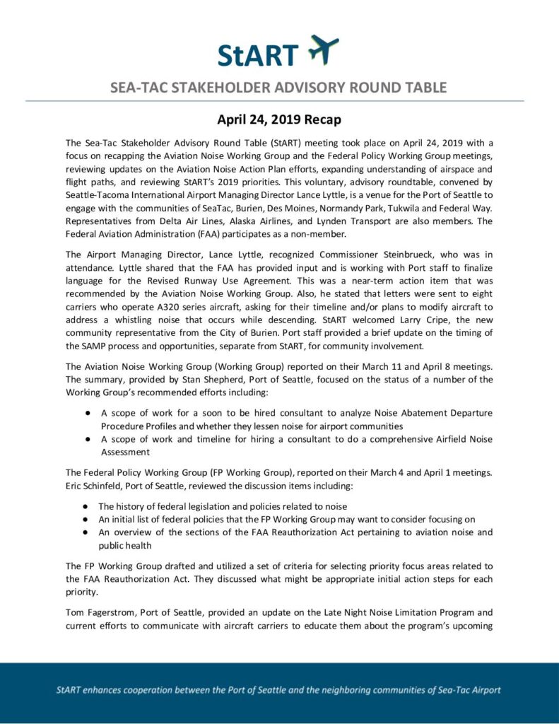 The Sea-Tac Stakeholder Advisory Round Table (StART) meeting took place on April 24, 2019 with a focus on recapping the Aviation Noise Working Group and the Federal Policy Working Group meetings, reviewing updates on the Aviation Noise Action Plan efforts, expanding understanding of airspace and flight paths, and reviewing StART’s 2019 priorities. This voluntary, advisory roundtable, convened by Seattle-Tacoma International Airport Managing Director Lance Lyttle, is a venue for the Port of Seattle to engage with the communities of SeaTac, Burien, Des Moines, Normandy Park, Tukwila and Federal Way. Representatives from Delta Air Lines, Alaska Airlines, and Lynden Transport are also members. The Federal Aviation Administration (FAA) participates as a non-member. The Airport Managing Director, Lance Lyttle, recognized Commissioner Steinbrueck, who was in attendance. Lyttle shared that the FAA has provided input and is working with Port staff to finalize language for the Revised Runway Use Agreement. This was a near-term action item that was recommended by the Aviation Noise Working Group. Also, he stated that letters were sent to eight carriers who operate A320 series aircraft, asking for their timeline and/or plans to modify aircraft to address a whistling noise that occurs while descending. StART welcomed Larry Cripe, the new community representative from the City of Burien. Port staff provided a brief update on the timing of the SAMP process and opportunities, separate from StART, for community involvement. The Aviation Noise Working Group (Working Group) reported on their March 11 and April 8 meetings. The summary, provided by Stan…