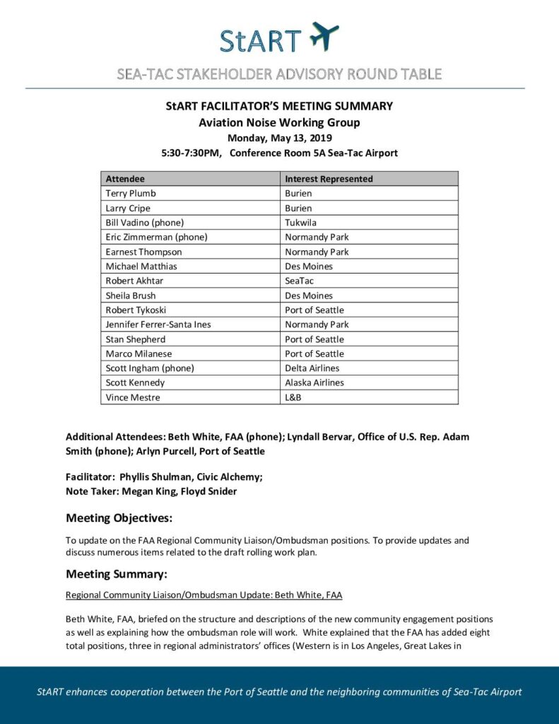 StART enhances cooperation between the Port of Seattle and the neighboring communities of Sea-Tac Airport StART FACILITATOR’S MEETING SUMMARY Aviation Noise Working Group Monday, May 13, 2019 5:30-7:30PM, Conference Room 5A Sea-Tac Airport Attendee Interest Represented Terry Plumb Burien Larry Cripe Burien Bill Vadino (phone) Tukwila Eric Zimmerman (phone) Normandy Park Earnest Thompson Normandy Park Michael Matthias Des Moines Robert Akhtar SeaTac Sheila Brush Des Moines Robert Tykoski Port of Seattle Jennifer Ferrer-Santa Ines Normandy Park Stan Shepherd Port of Seattle Marco Milanese Port of Seattle Scott Ingham (phone) Delta Airlines Scott Kennedy Alaska Airlines Vince Mestre L&B Additional Attendees: Beth White, FAA (phone); Lyndall Bervar, Office of U.S. Rep. Adam Smith (phone); Arlyn Purcell, Port of Seattle Facilitator: Phyllis Shulman, Civic Alchemy; Note Taker: Megan King, Floyd Snider Meeting Objectives: To update on the FAA Regional Community Liaison/Ombudsman positions. To provide updates and discuss numerous items related to the draft rolling work plan. Meeting Summary: Regional Community Liaison/Ombudsman Update: Beth White, FAA Beth White, FAA, briefed on the structure and descriptions of the new community engagement positions as well as explaining how the ombudsman role will work. White explained that the FAA has added eight total positions, three in regional administrators’ offices (Western is in Los Angeles, Great Lakes in /Users/phyllis/Documents/Civic Alchemy/StART/Noise Working Group/2019/Meeting summaries/Final Meeting Summaries/05-13-19 Meeting Summary_Av Noise Subgroup.docx May 13, 2019 StART Facilitator’s Meeting Summary May 13, 2019 Page 2 Chicago, and East in New York), position assigned to focus on noise complaints, two positions based…