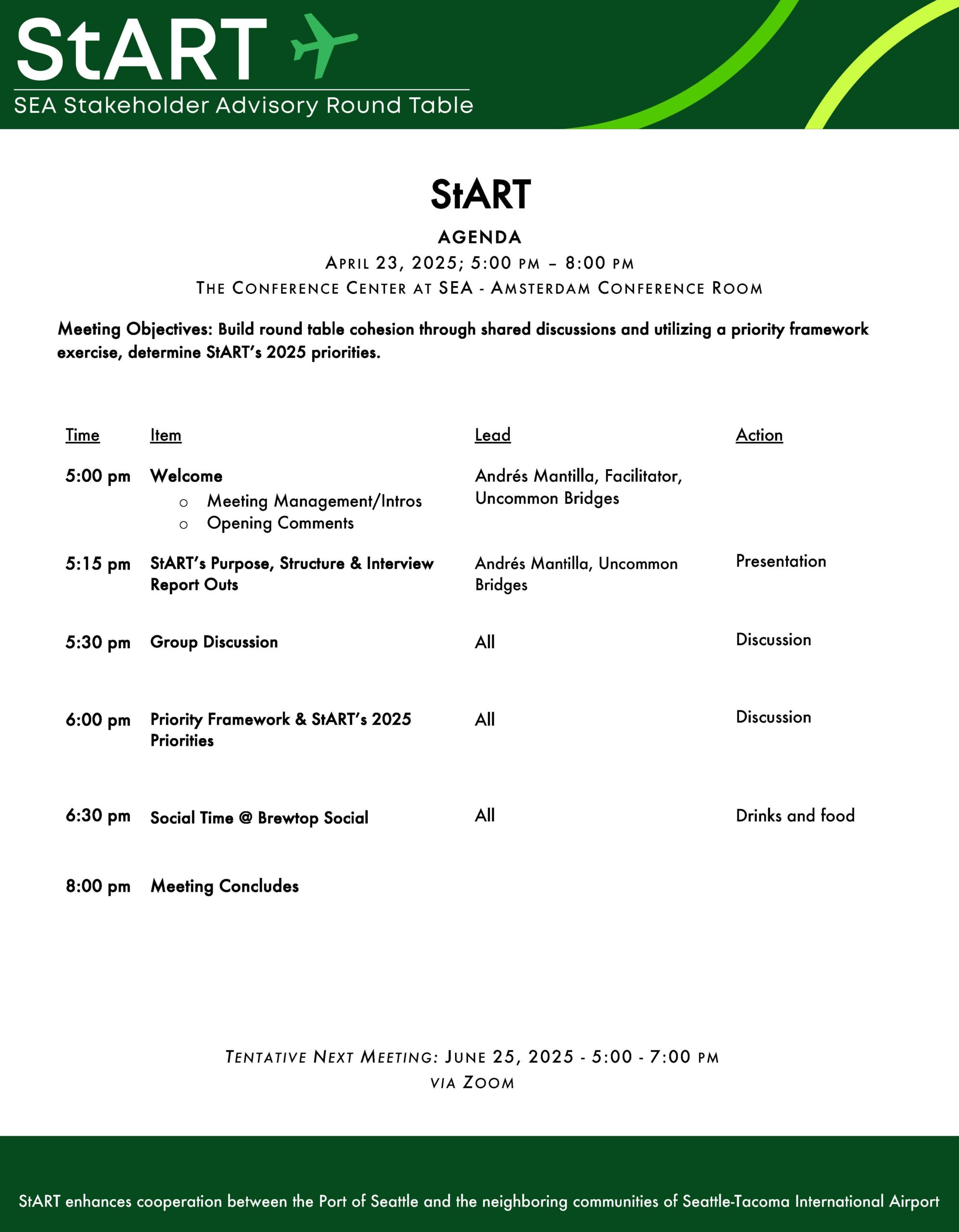 StART Meeting – April 23, 2025 (5:00–8:00 PM) 📍 Amsterdam Conference Room, SEA Conference Center Objective: “Build round table cohesion… determine StART’s 2025 priorities.” Agenda Highlights: 5:00 PM – Welcome and Opening Comments (Andrés Mantilla, Uncommon Bridges) 5:15 PM – “StART’s Purpose, Structure & Interview Report Outs” 5:30 PM – Group Discussion 6:00 PM – “Priority Framework & StART’s 2025 Priorities” 6:30 PM – Social time @ Brewtop Social 8:00 PM – Meeting concludes Note: Meeting is closed to the public, which is a major change from past practice.
