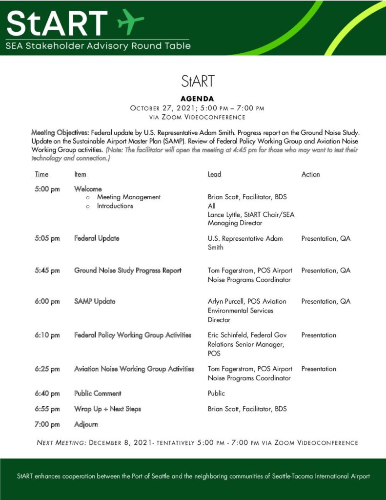 StART enhances cooperation between the Port of Seattle and the neighboring communities of Seattle-Tacoma International Airport StART AGENDA OCTOBER 27, 2021; 5:00 PM – 7:00 PM VIA ZOOM V IDEOCONFERENCE Meeting Objectives: Federal update by U.S. Representative Adam Smith. Progress report on the Ground Noise Study. Update on the Sustainable Airport Master Plan (SAMP). Review of Federal Policy Working Group and Aviation Noise Working Group activities. (Note: The facilitator will open the meeting at 4:45 pm for those who may want to test their technology and connection.) Time Item Lead Action 5:00 pm Welcome o Meeting Management o Introductions