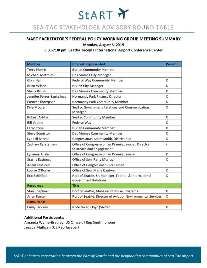 StART enhances cooperation between the Port of Seattle and the neighboring communities of Sea-Tac Airport StART FACILITATOR’S FEDERAL POLICY WORKING GROUP MEETING SUMMARY Monday, August 5, 2019 5:30-7:30 pm, Seattle Tacoma International Airport Conference Center Member Interest Represented Present Terry Plumb Burien Community Member - Michael Matthias Des Moines City Manager - Chris Hall Federal Way Community Member X Brian Wilson Burien City Manager X Sheila Brush Des Moines Community Member X Jennifer Ferrer-Santa Ines Normandy Park Finance Director X Earnest Thompson Normandy Park Community Member X Kyle Moore SeaTac Government Relations and Communication Manager X Robert Akhtar SeaTac Community Member X Bill Vadino Federal Way X Larry Cripe Burien Community Member X Steve Edmiston Des Moines Community Member X Lyndall Bervar Congressman Adam Smith, District Rep X Zachary Carstensen Office of Congresswoman Pramila Jayapal, Director, Outreach and Engagement - Lylianna Allala Office of Congresswoman Pramila Jayapal X Stasha Espinosa Office of Sen. Patty Murray X Adam LeMieux Office of Congressman Rick Larsen - Louise O’Rorke Office of Sen. Maria Cantwell X Eric Schinfeld Port of Seattle, Sr. Manager, Federal & International Government Relations X Resources Title Stan Shepherd Port of Seattle, Manager of Noise Programs X Arlyn Purcell Port of Seattle, Director of Aviation Environmental Services X Consultants Emily Jackson Note taker, Floyd|Snider X Additional Participants: Amanda Wyma-Bradley, US Office of Rep Smith, phone Jessica Mulligan (US Rep Jayapal) Aug 5, 2019 Federal Policy Working Group Aug 5, 2019 Page 2 Meeting Objectives To provide feedback on draft legislation…