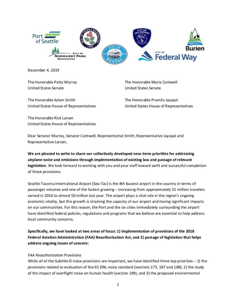 The Honorable Patty Murray The Honorable Maria Cantwell United States Senate United States Senate The Honorable Adam Smith The Honorable Pramila Jayapal United States House of Representatives United States House of Representatives The Honorable Rick Larsen United States House of Representatives Dear Senator Murray, Senator Cantwell, Representative Smith, Representative Jayapal and Representative Larsen, We are pleased to write to share our collectively developed near-term priorities for addressing airplane noise and emissions through implementation of existing law and passage of relevant legislation. We look forward to working with you and your staff toward swift and successful completion of these provisions. Seattle-Tacoma International Airport (Sea-Tac) is the 8th busiest airport in the country in terms of passenger volumes and one of the fastest growing – increasing from approximately 31 million travelers served in 2010 to almost 50 million last year. The airport plays a vital role in the region’s ongoing economic vitality, but this growth is straining the capacity of our airport and having significant impacts on our communities. For this reason, the Port and the six cities immediately surrounding the airport have identified federal policies, regulations and programs that we believe are essential to help address local community concerns. Specifically, we have looked at two areas of focus: 1) implementation of provisions of the 2018 Federal Aviation Administration (FAA) Reauthorization Act, and 2) passage of legislation that helps address ongoing issues of concern: FAA Reauthorization Provisions While all of the Subtitle D noise provisions are important, we have identified three top…