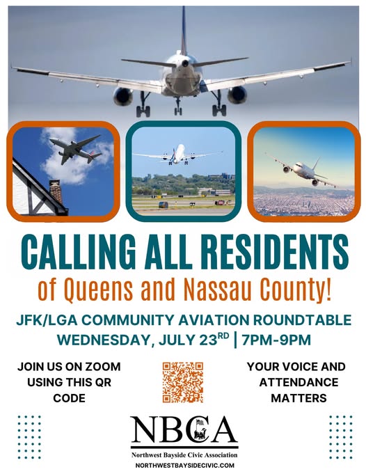 Northwest Bayside Civic Association announces a community aviation roundtable meeting for Queens and Nassau County residents regarding JFK and LaGuardia airports. The virtual meeting aims to gather community input on aviation-related issues affecting local residents. -
