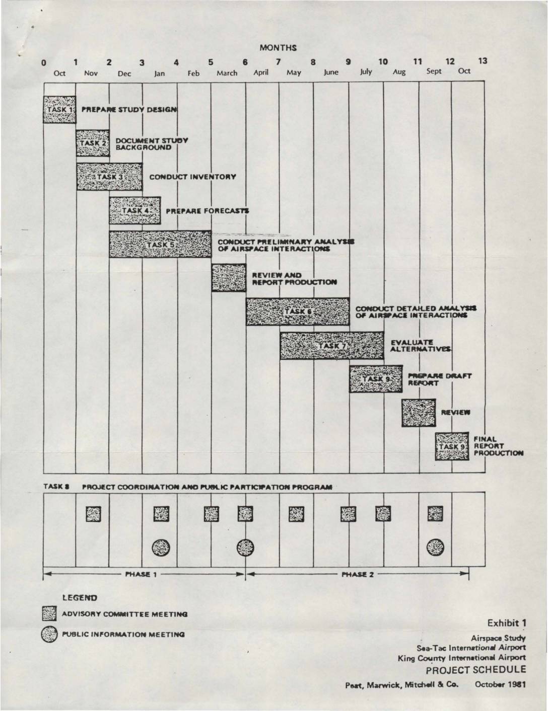 A project schedule chart showing the timeline and phases for an airspace study conducted by Peat, Marwick, Mitchell & Co. The study includes tasks like document study, inventory, forecasts, airspace interaction analysis, and alternatives evaluation spanning from October 1981 to October of the following year. -