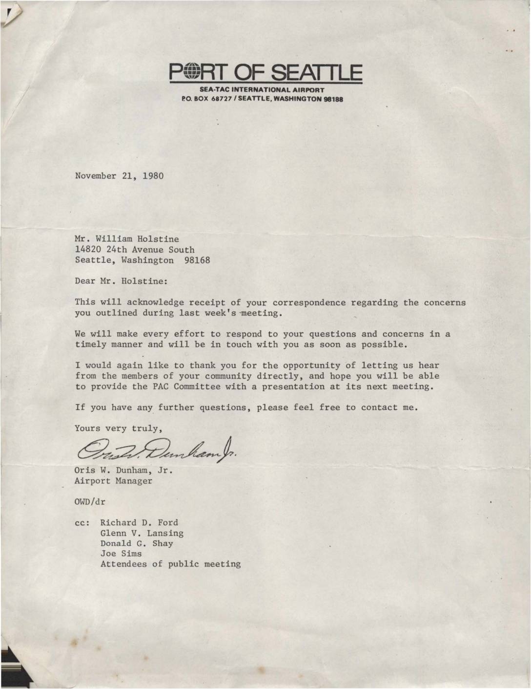A follow-up letter from Sea-Tac International Airport Manager Oris W. Dunham Jr. to William Holstine acknowledging receipt of correspondence regarding concerns discussed at a recent public meeting. The letter promises timely responses to community questions and invites Holstine to present to the PAC Committee. -