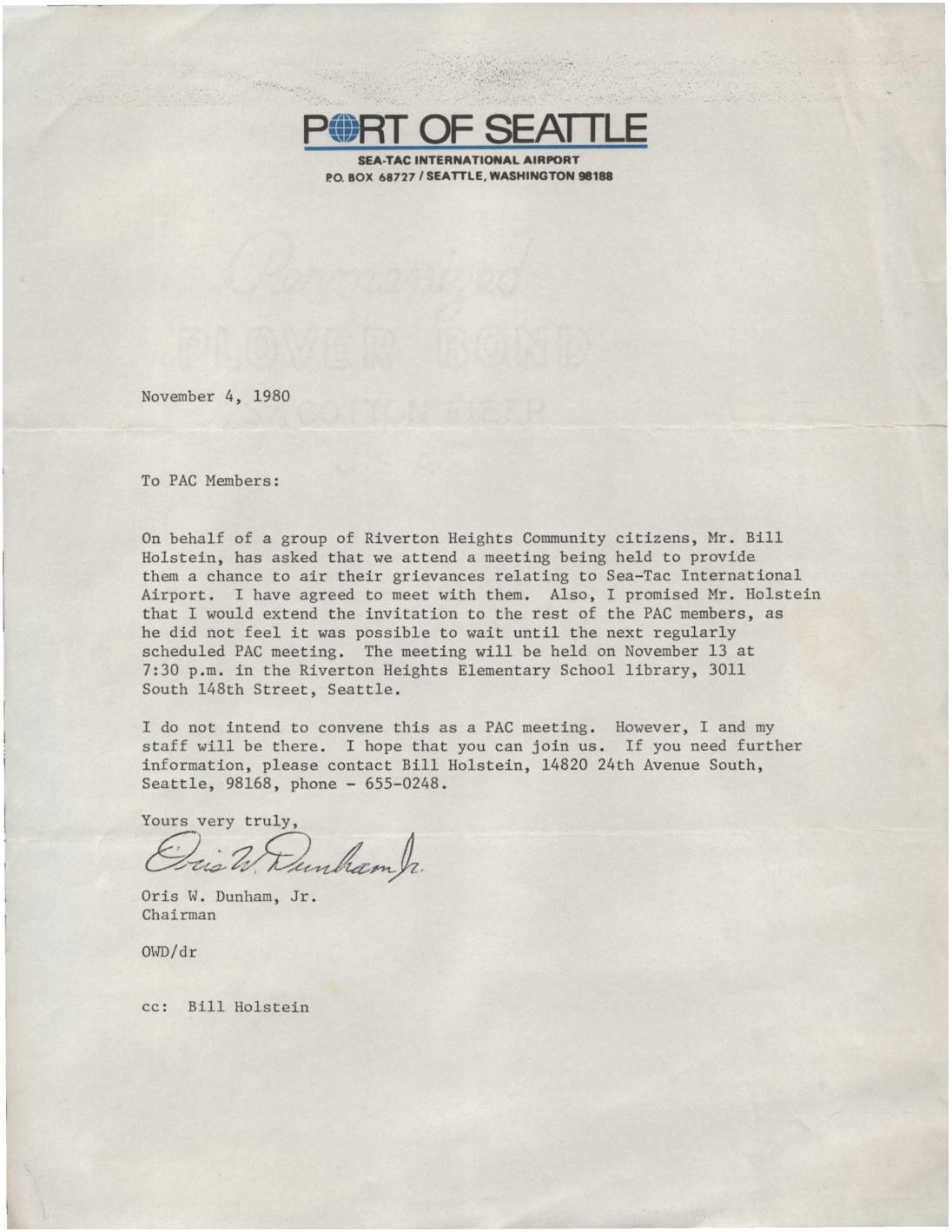 Letter from Port of Seattle PAC Chairman Oris Dunham Jr. inviting PAC members to attend a community meeting with Riverton Heights citizens to discuss their grievances relating to Sea-Tac International Airport. The meeting was scheduled for November 13, 1980 at Riverton Heights Elementary School.