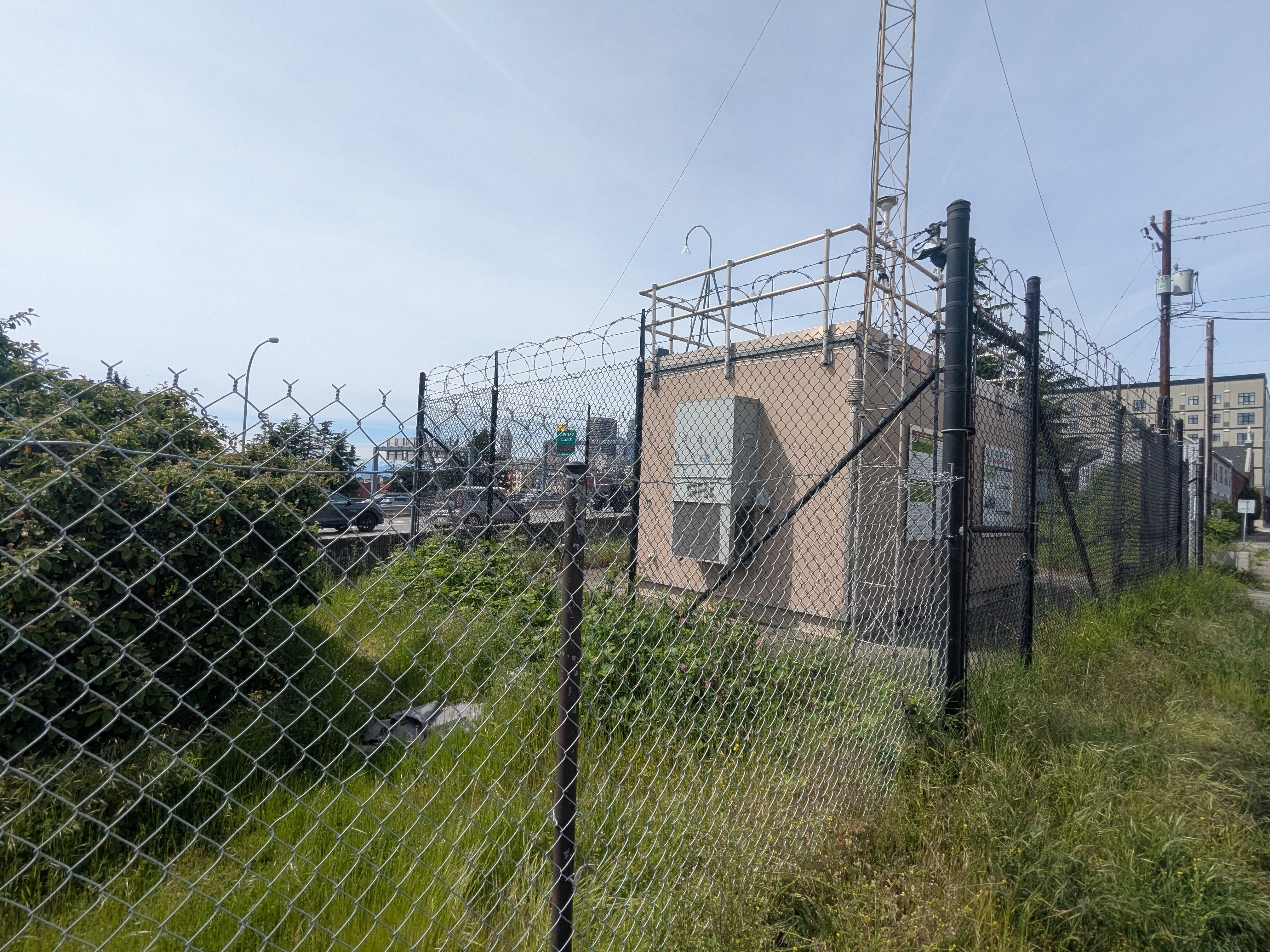 Wide view of the 10th & Weller AQM station from across the road, showing antenna mast and station building.