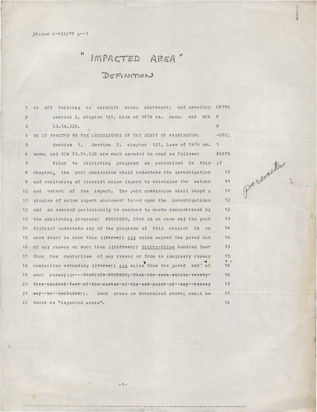 Washington State legislation (H-602/79) amending aircraft noise abatement laws. The act modifies distance restrictions for port district noise mitigation programs, changing limits from three miles to six miles beyond runway ends and from fifteen hundred to thirty-three hundred feet from runway centerlines for defining ‘impacted areas’. -