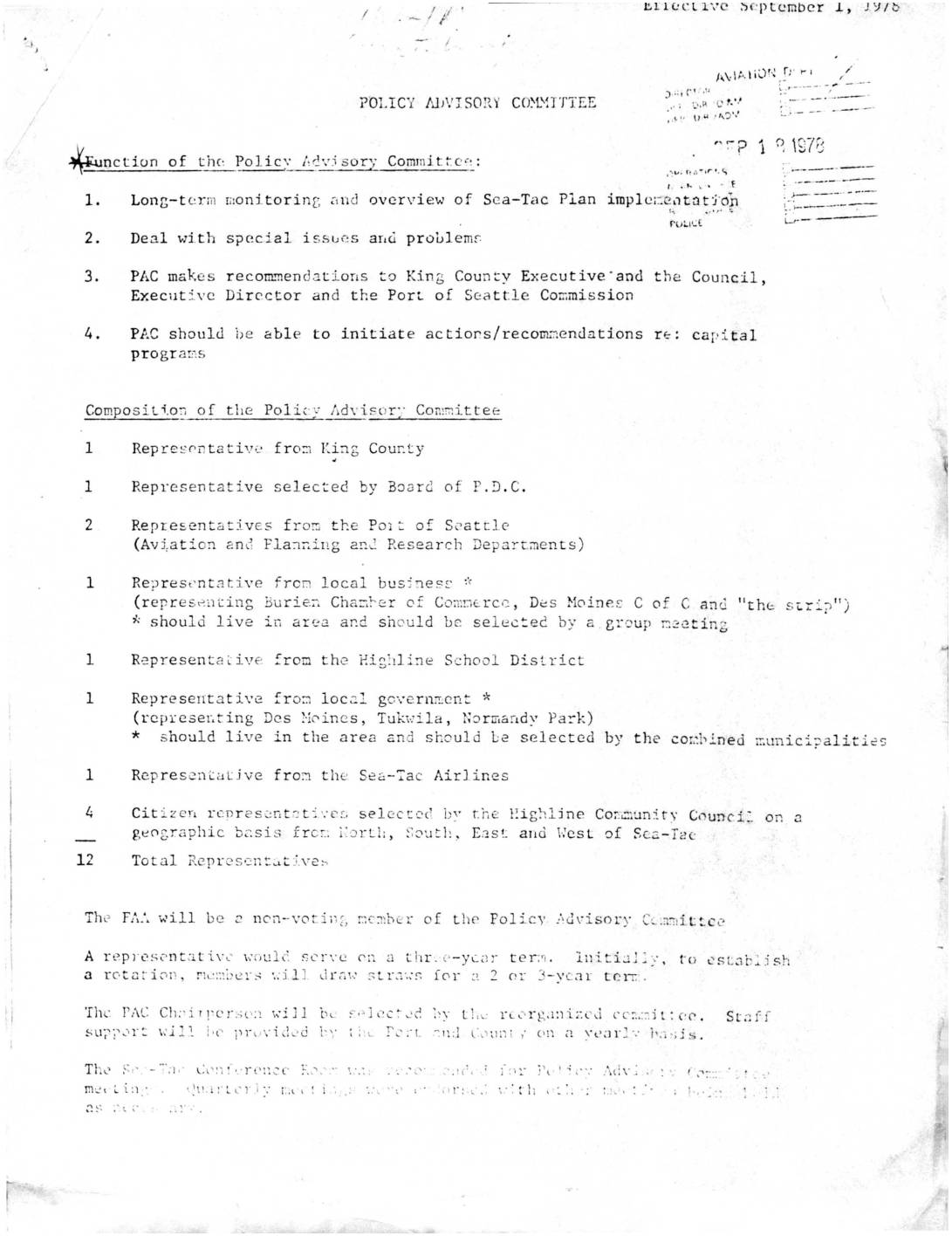1. Long-t e: r m won i torin r, .:-mel overv iew of Se a-Tac Plan impl c::-.c.1t,nt:i ·cn :.:. __ ,,. '.: 2. Deal with speci al i ss~ c s aDd proLlemG 3. PAC mske s recom.TTien da. t i ons to Kin g Coun ::y Executive · and t he Council, Execat ::.vc Director and the Port o f Sea ttle Corr.mi ss ion 4. PAC should he able to initiate ac tior.s/recom;:;endations r ~;- : ca pi tal pro gr aF:S Composil i.o;; of the Fol i c •,.; lldvi.su r·: Comr;;itte e Repre s 0ntativ0 fro~ K~ng Cou~ ty Representativ e selected by Board o f P.J .C. Rep resent a tive s f r o!" the Po1:: of Se at tle (Av j,ation a n d Flan~ing a~J Research Departmen ts) Rep re s ~ nt a t ive f ran loca l bus jn e s~ * - ------· .. - ---· ~- 978 ~ -: - ----- --- ~ ;.---·· --·- ~-------~--:-- ~---- (rep r es~nting Buri e.:;t Cha:::-,:--er of Con:Dt. rc .-:; , De s Hoine f: C o f C an d "th(;. s L.r i.~ " ) ~should live i n area and s hould be selected by a . gra up cee ting Repre sen t ai: ive from the P.i;h line School Distr ic t Represen t a t ive fr o:-:1 loc a.l goYe rnrr,c nt * (rcpreser.ting De s !·k·ine s, Tuh.'i l a ,…