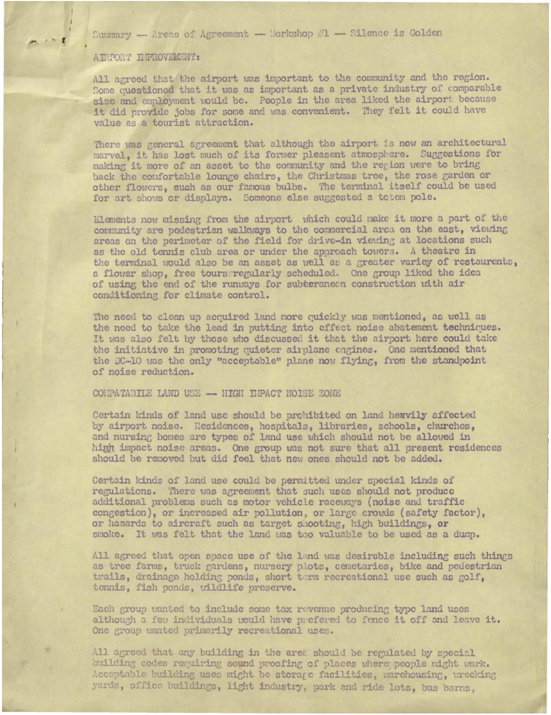 A community workshop summary discussing airport improvements, compatible land use in high impact noise zones, and community concerns about Sea-Tac Airport. The document covers suggestions for making the airport more community-friendly and guidelines for appropriate land uses in noise-affected areas.