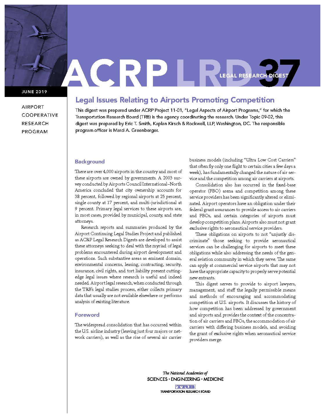 There are over 4,000 airports in the country and most of these airports are owned by governments. A 2003 sur- vey conducted by Airports Council International–North America concluded that city ownership accounts for percent, followed by regional airports at 25 percent, single county at 17 percent, and multi-jurisdictional at percent. Primary legal services to these airports are, in most cases, provided by municipal, county, and state attorneys. Research reports and summaries produced by the Airport Continuing Legal Studies Project and published as ACRP Legal Research Digests are developed to assist these attorneys seeking to deal with the myriad of legal problems encountered during airport development and operations. Such substantive areas as eminent domain, environmental concerns, leasing, contracting, security, insurance, civil rights, and tort liability present cutting- edge legal issues where research is useful and indeed needed. Airport legal research, when conducted through the TRB’s legal studies process, either collects primary data that usually are not available elsewhere or performs analysis of existing literature. Foreword The widespread consolidation that has occurred within the U.S. airline industry (leaving just four majors or net- work carriers), as well as the rise of several air carrier business models (including “Ultra Low Cost Carriers” that often fly only one flight to certain cities a few days a week), has fundamentally changed the nature of air ser- vice and the competition among air carriers at airports. Consolidation also has occurred in the fixed-base operator (FBO) arena and competition among these service providers has been significantly altered…