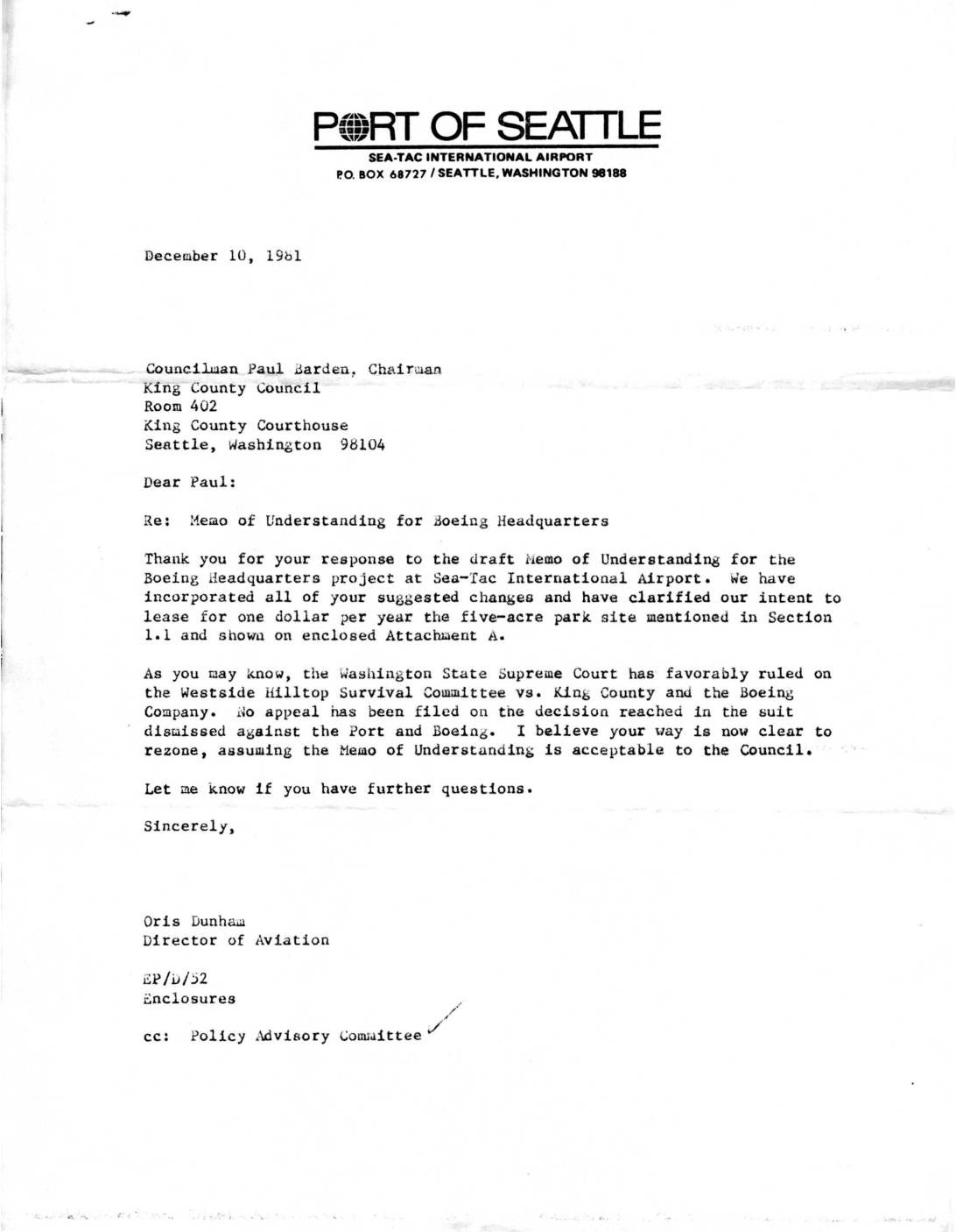 Letter from Port of Seattle Director of Aviation Oris Dunham to King County Council Chairman Paul Barden regarding a Memo of Understanding for Boeing Headquarters project at Sea-Tac International Airport. Includes discussion of rezoning approval following favorable Washington State Supreme Court ruling. -