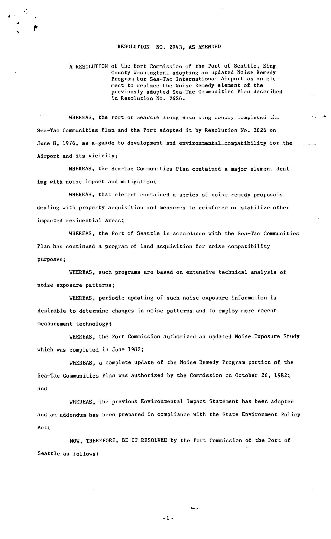 A RESOLUTION of the Port Commission of the Port of Seattle, King County Washington, adopting an updated Noise Remedy Program for Sea-Tac International Airport as an ele- ment to replace the Noise Remedy element of the previously adopted Sea-Tac Communities Plan described in Resolution No. 2626. Wllt:KEAS, the l:'Or't OI '>ea..::t.:.Le· aJ.oug Wl. LU 1..LU~ .IVUln.y . . ..Vdi)!J.t::l..c::.u Sea-Tac Communities Plan and the Port adopted it by Resolution No. 2626 on '• June 8, 1976, as-a-~id~development and environmental compatihiliLy for~th~e ______ __ Airport and its vicinity; WHEREAS, the Sea-Tac Communities Plan contained a major element deal- ing with noise impact and mitigation; WHEREAS, that element contained a series of noise remedy proposals . dealing with property acquisition and measures to reinforce or stabilize other impacted residential areas; WHEREAS, the Port of Seattle in accordance with the Sea-Tac Communities Plan has continued a program of land acquisition for noise compatibility purposes; WHEREAS, such programs are based on extensive technical analysis of noise exposure patterns; WHEREAS, periodic updating of such noise exposure information is desirable to determine changes in noise patterns and to employ more recent measurement technology; WHEREAS, the Port Commission authorized an updated Noise Exposure Study which was completed in June 1982; WHEREAS, a complete update of the Noise Remedy Program portion of the Sea-Tac Communities Plan was authorized by the Commission on October 26, 1982; and WHEREAS, the previous Environmental Impact Statement has been adopted and an addendum has been prepared in compliance with the State Environment Policy…