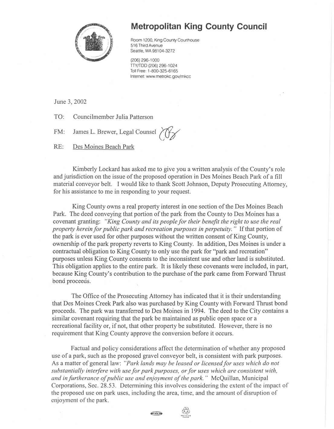 FM: James L. Brewer, Legal Counsel ("{i;f" RE: Des Moines Beach Park Kimberly Lockard has asked me to give you a written analysis of the County's role and jurisdiction on the issue of the proposed operation in Des Moines Beach Park of a fill material conveyor belt. I would like to thank Scott Johnson, Deputy Prosecuting Attorney, for his assistance to me in responding to your request. King County owns a real property interest in one section of the Des Moines Beach Park. The deed conveying that portion of the park from the County to Des Moines has a covenant granting: "King County and its people for their benefit the right to use the real property herein for public park and recreation purposes in perpetuity." If that portion of the park is ever used for other purposes without the written consent of King County, ownership of the park property reverts to King County. In addition, Des Moines is under a contractual obligation to King County to only use the park for "park and recreation" purposes unless King County consents to the inconsistent use and other land is substituted. This obligation applies to the entire park. It is likely these covenants were included, in part, because King County's contribution to the purchase of the park came from Forward Thrust bond proceecis. The Office of the Prosecuting Attorney has indicated that it is their understanding that Des Moines Creek Park also was purchased by King County with Forward Thrust bond proceeds. The… -