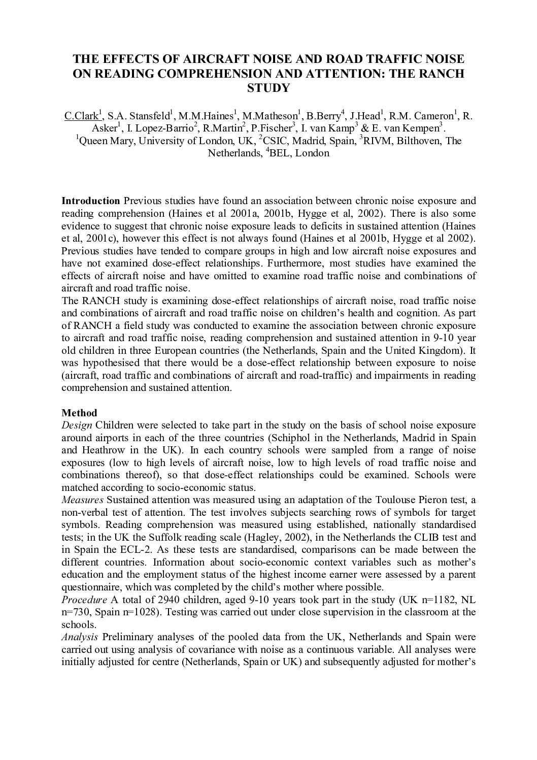 A European research study examining the dose-effect relationships between aircraft noise, road traffic noise, and their combinations on reading comprehension and sustained attention in 9-10 year old children across the Netherlands, Spain, and the United Kingdom. The study found significant impairment in reading comprehension associated with aircraft noise exposure but no effects from road traffic -