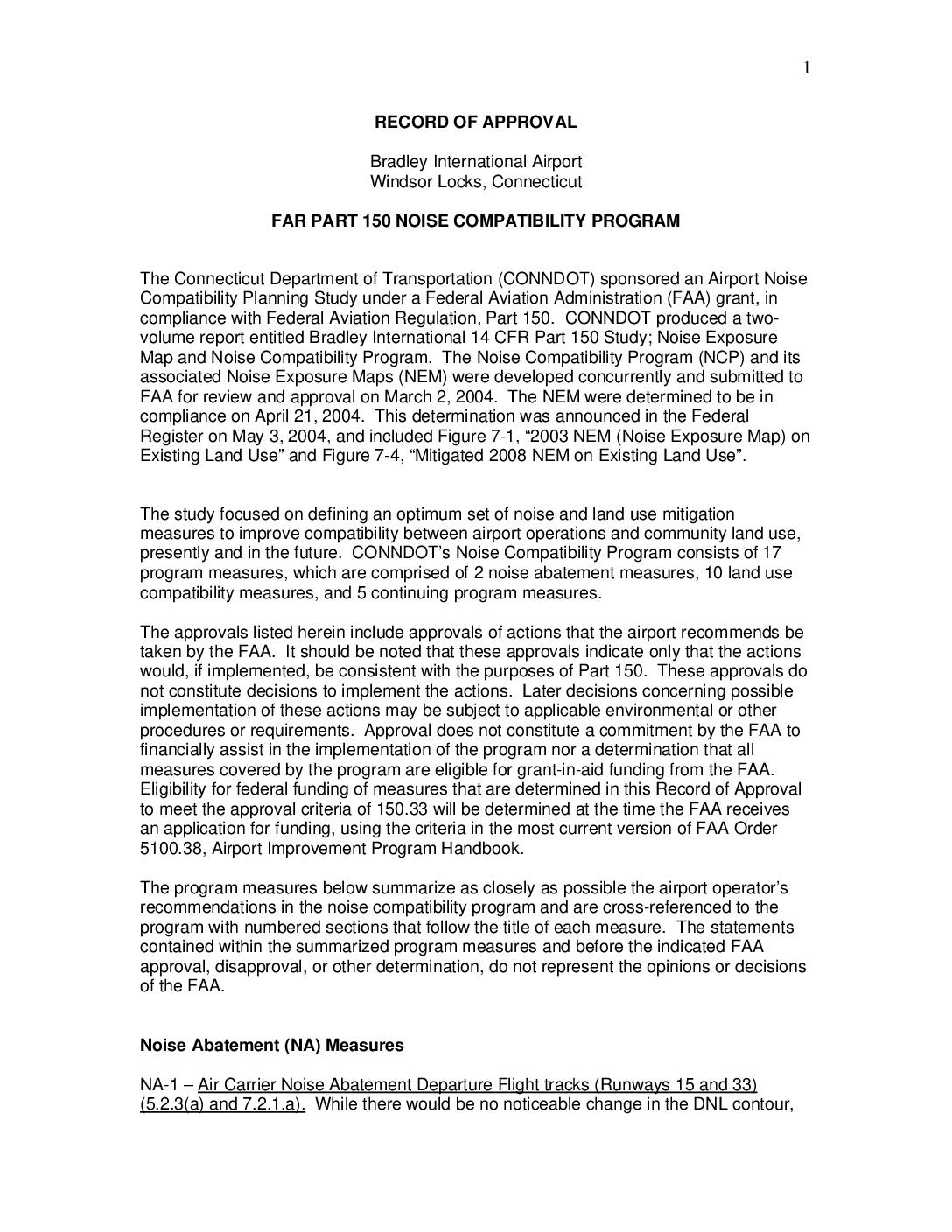FAR Part 150 Noise Compatibility Program Record of Approval – Bradley International Airport