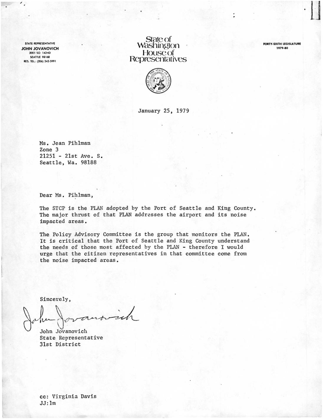 The STCP is the PLAN adopted by the Port of Seattle and King County. The major th1~st of that PLAN addresses the airport and its noise impacted areas. The Policy Advisory Committee is the group that monitors the PLAN. It is critical that the Port of Seattle and King County understand the needs of those most affected by the PLAN - therefore I would urge that the citizen representatives in that committee come from the noise impacted areas. Sincerely, &J~~~~-tv-JL John Jovanovich State Representative 31st District cc: Virginia Davis JJ:lm FOaTY -S1XTI1 LEG1SlA TURE 1979-10 l.J -
