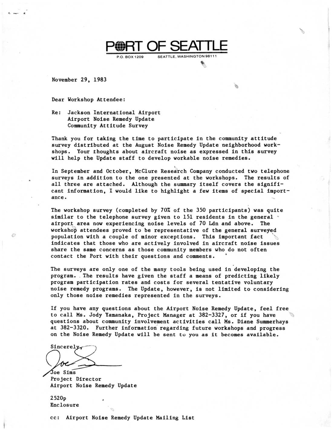 Thank you for taking the time to participate in the community attitude survey distributed at the August Noise Remedy Update neighborhood work- shops. Your thoughts about aircraft noise as expressed in this survey will help the Update staff to develop workable noise remedies. ' In September and October, McClure Resea~ch Company conducted two telephone surveys in addition to the one presented at the workshops. The results of all three are attached. Although the summary itself covers the signifi- cant information, I would like to highlight a few items of special import- ance. The workshop survey {completed by 70% of the 350 participants) was quite similar to the telephone survey given to 151 residents in the general • airpor.t area now experiencing noise levels of 70 Ldn and above. The workshdP attendees proved to be representative of the general surveyed population with a couple of minor exceptions. This important fact ' J indicates that those who are actively involved in aircraft noise issues share the same concerns as those community members who do not often contact the Port with their questions and comments. The surveys are only one of the many tools being used in developing the program • . The results have given the staff a means of predicting likely program participation rates and costs for several tentative voluntary noise remedy programs. The Update, however, is not limited to considering only those noise remedies represented in the surveys. If you have any questions about the Airport Noise Remedy Update, feel… -