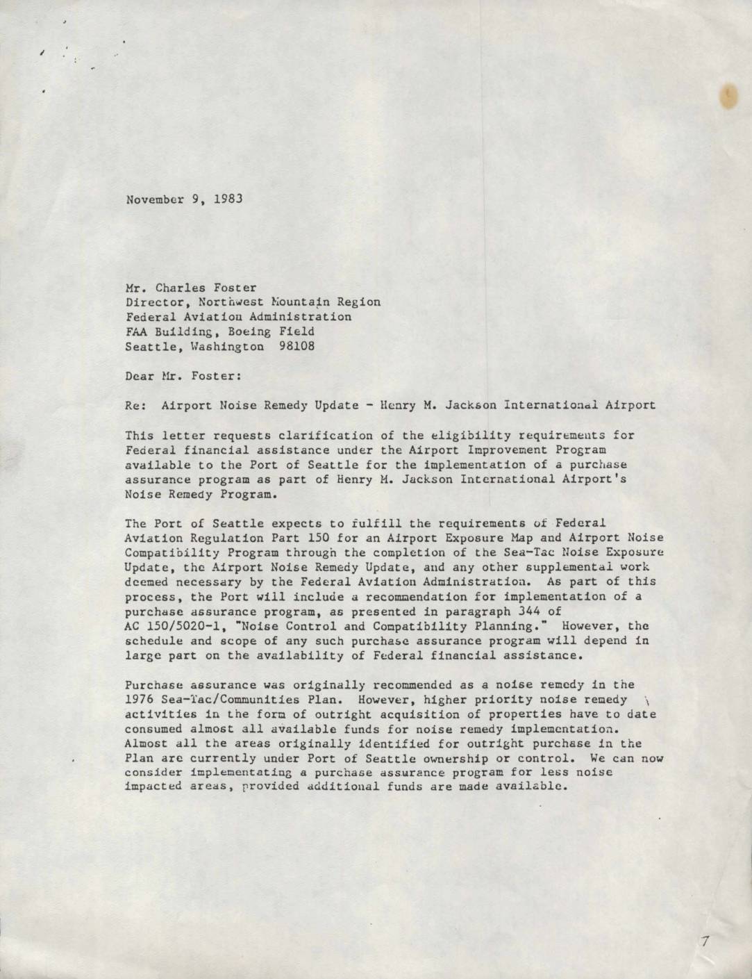 Letter from Port of Seattle Executive Director Richard D. Ford to FAA Regional Director Charles Foster requesting clarification on federal financial assistance eligibility for implementing a purchase assurance program as part of Sea-Tac Airport’s noise remedy program. The letter outlines specific questions about costs, property types, implementation requirements, and compliance issues.