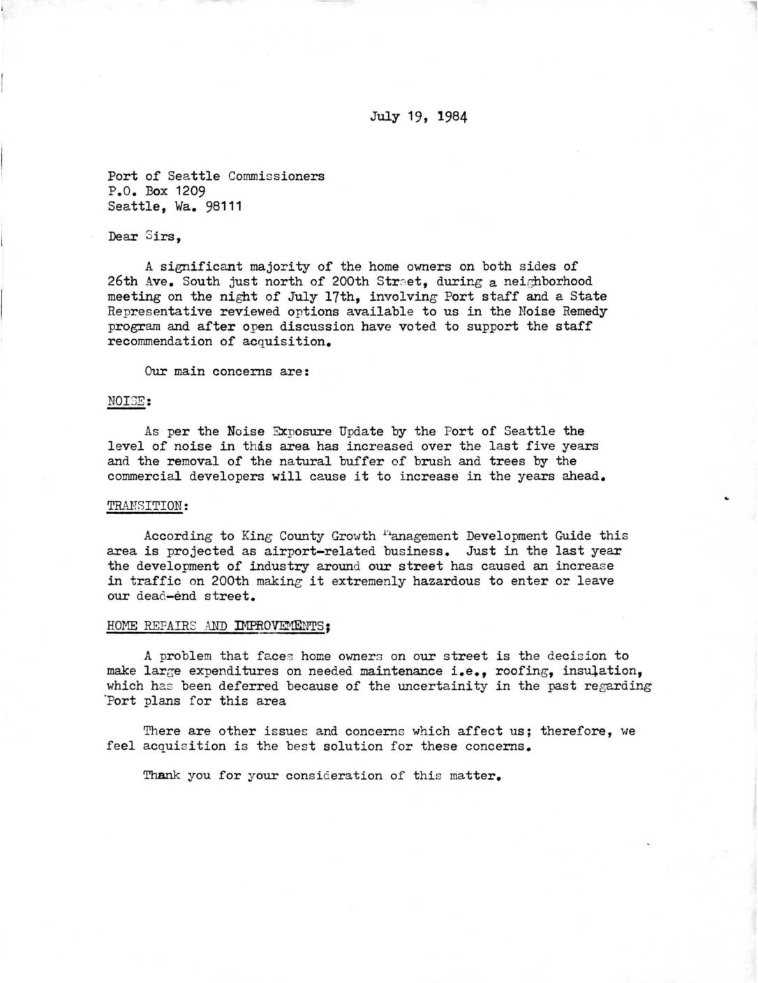 Letter from homeowners on 26th Ave. South near 200th Street to Port of Seattle Commissioners requesting acquisition of their properties through the Noise Remedy program. The residents cite increasing noise levels, commercial development impacts, traffic hazards, and deferred home maintenance as reasons for supporting acquisition. -