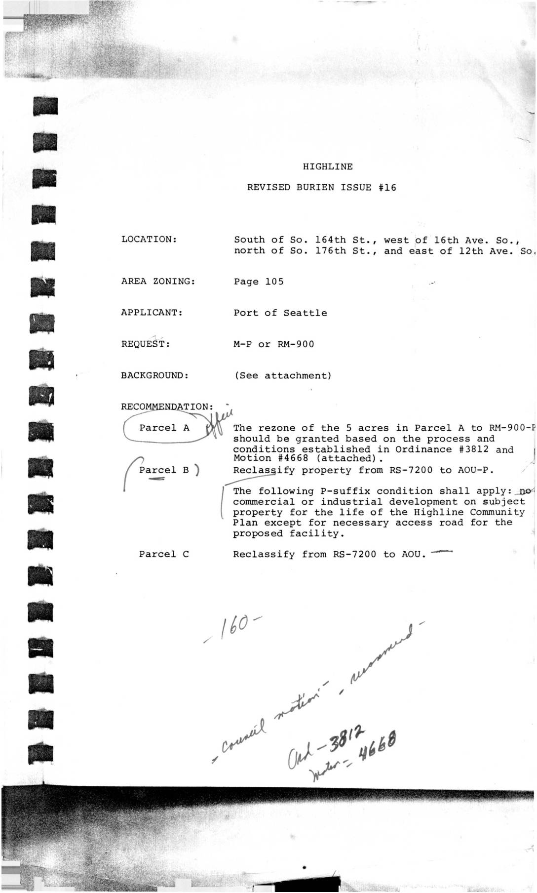A zoning reclassification request by the Port of Seattle for property south of So. 164th St. in the Highline area. The document shows recommendations for three parcels: Parcel A to be rezoned to RM-900-P, Parcel B to be reclassified from RS-7200 to AOU-P with restrictions on commercial/industrial development, and Parcel C to be reclassified from