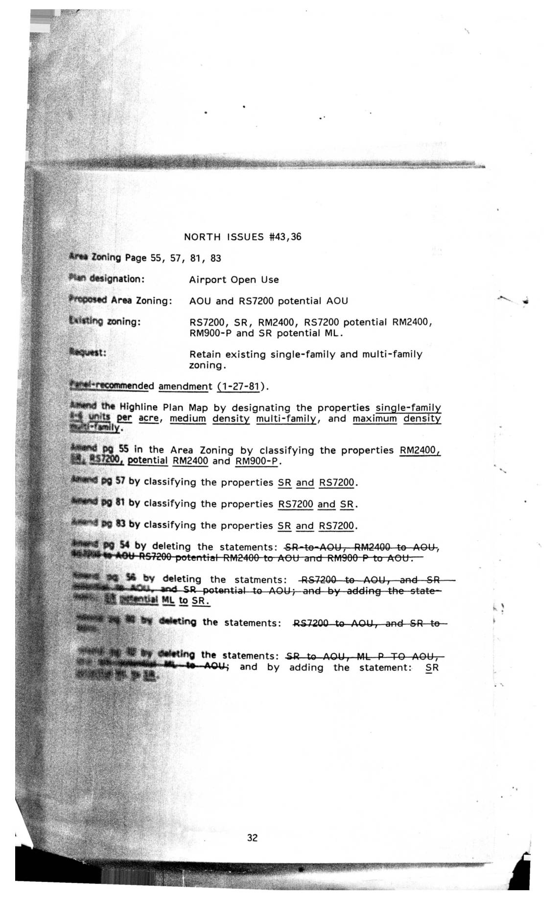 Zoning amendment document for Highline area properties regarding Airport Open Use designation. Details proposed changes from existing single-family and multi-family zoning classifications to AOU and RS7200 potential AOU, with specific amendments to Area Zoning pages 55, 57, 81, and 83. -