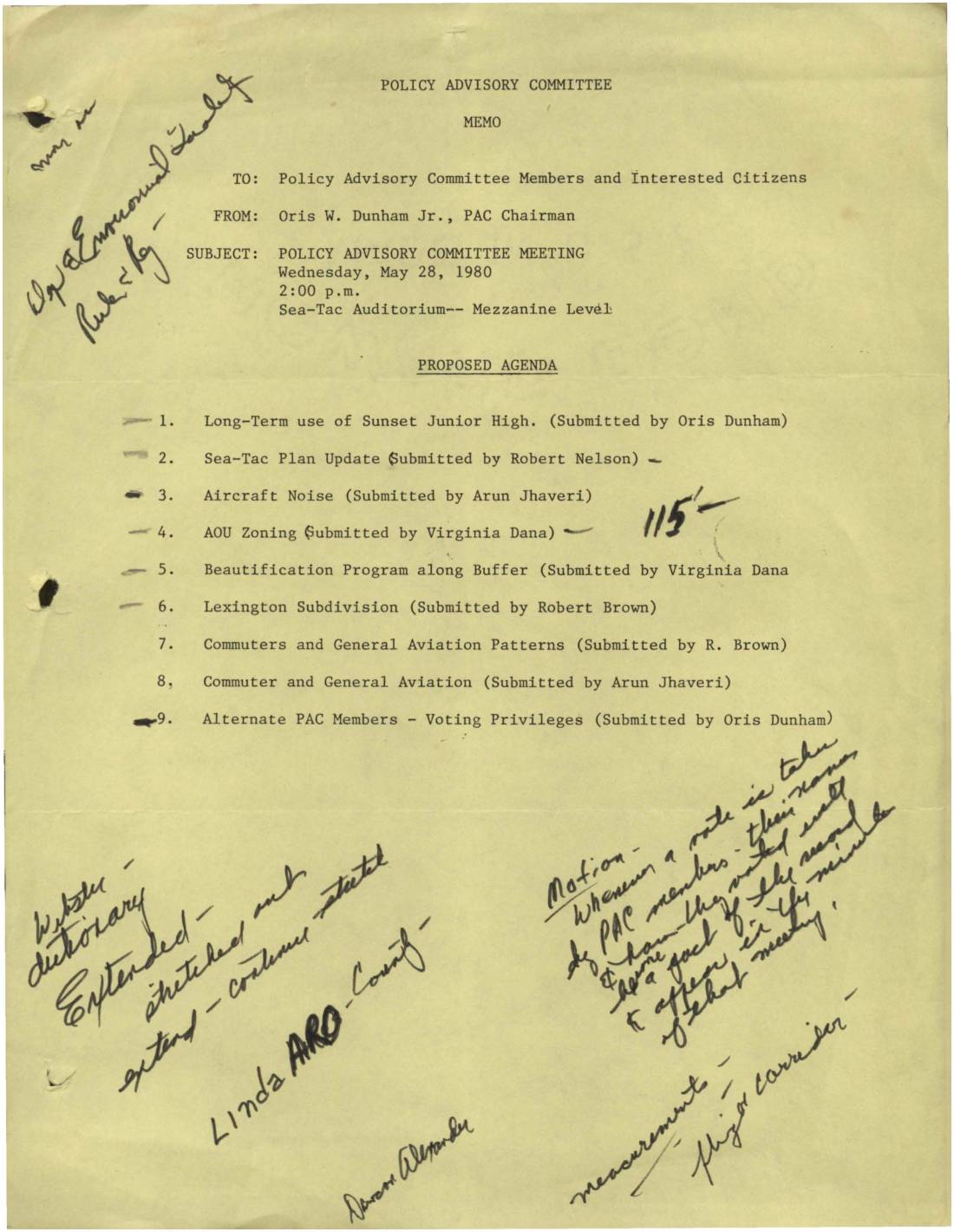 Meeting agenda for Policy Advisory Committee meeting on May 28, 1980 at Sea-Tac Mezzanine. Nine agenda items include long-term use of Sunset Junior High, Sea-Tac Plan Update, aircraft noise, zoning issues, beautification programs, and aviation patterns. -