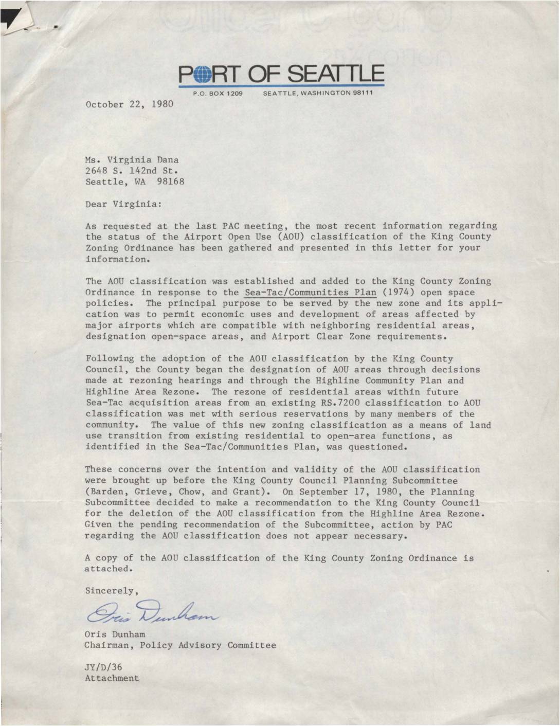 Letter from Port of Seattle Policy Advisory Committee Chairman Oris Dunham to Virginia Dana providing status update on the Airport Open Use (AOU) classification in King County Zoning Ordinance. The letter explains the AOU classification’s purpose for economic development near airports and community concerns that led to a recommendation for deletion from the Highline Area -