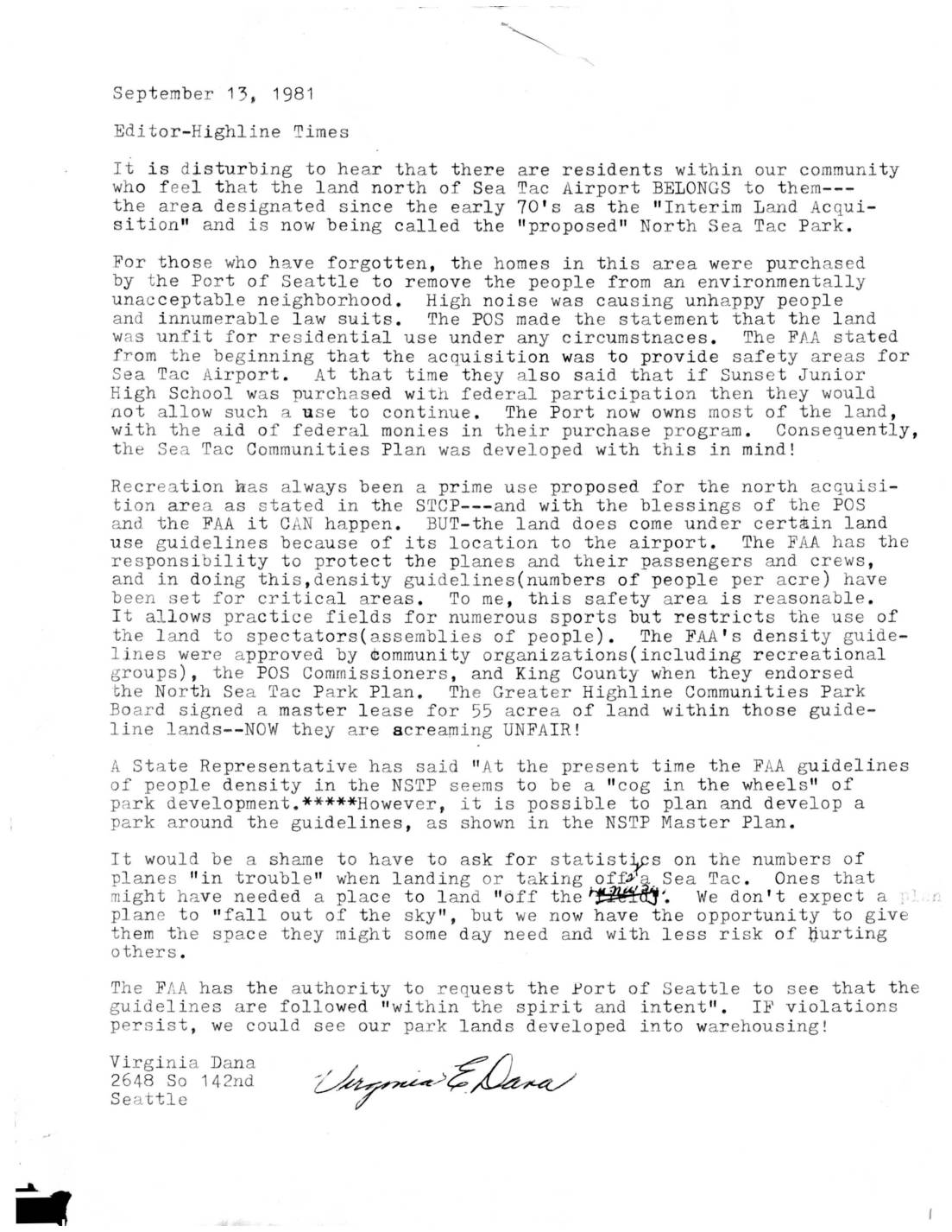 A letter to the editor of Highline Times discussing the Port of Seattle’s acquisition of land north of Sea-Tac Airport for safety purposes and defending FAA density guidelines for the proposed North SeaTac Park. The author argues that the land was purchased to remove residents from an environmentally unacceptable area and should be restricted to -