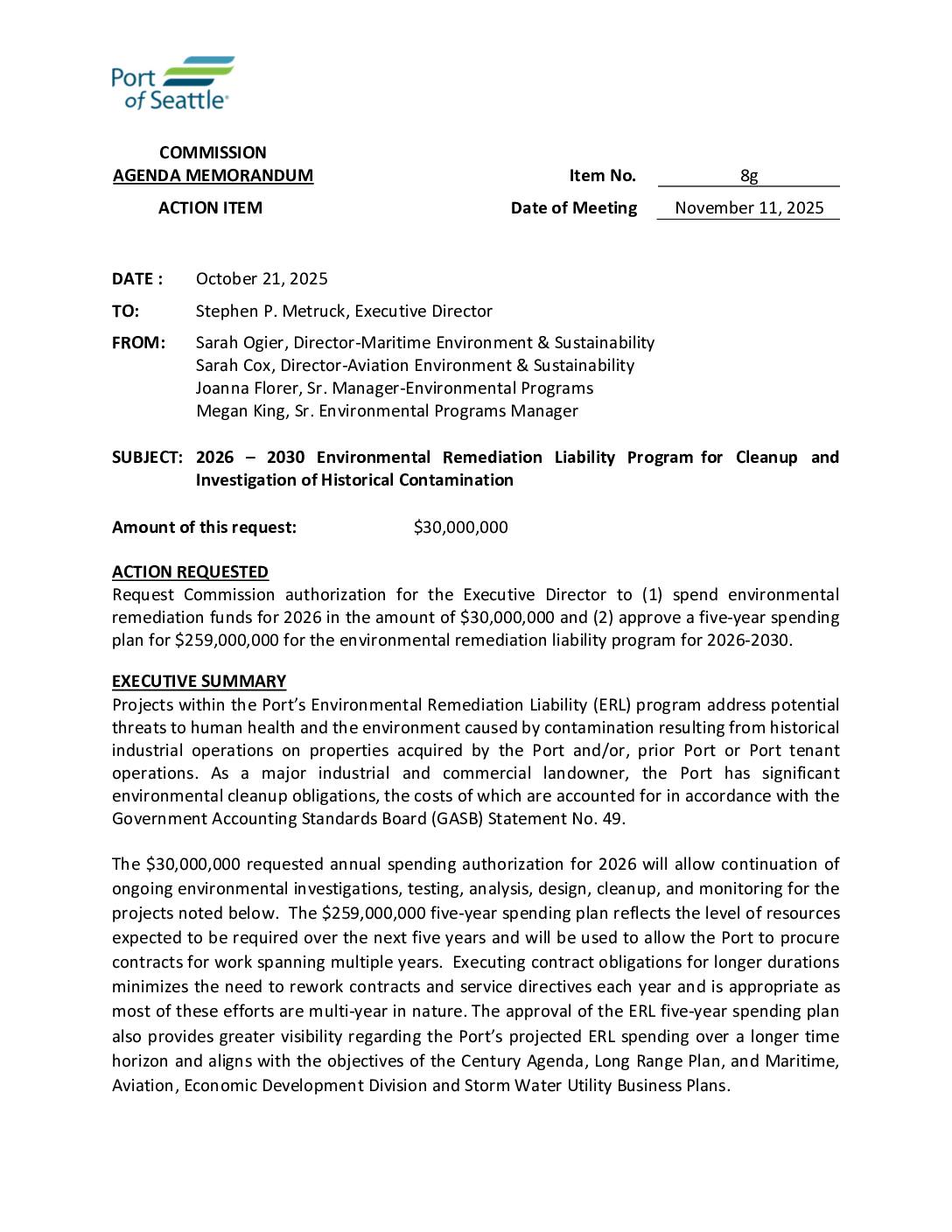Port of Seattle Commission agenda memorandum requesting $30 million for 2026 environmental remediation and approval of a $259 million five-year spending plan for cleanup of historical contamination at maritime and aviation properties. The program addresses contamination from past industrial operations including Lower Duwamish Waterway Superfund Site and various terminal locations. -