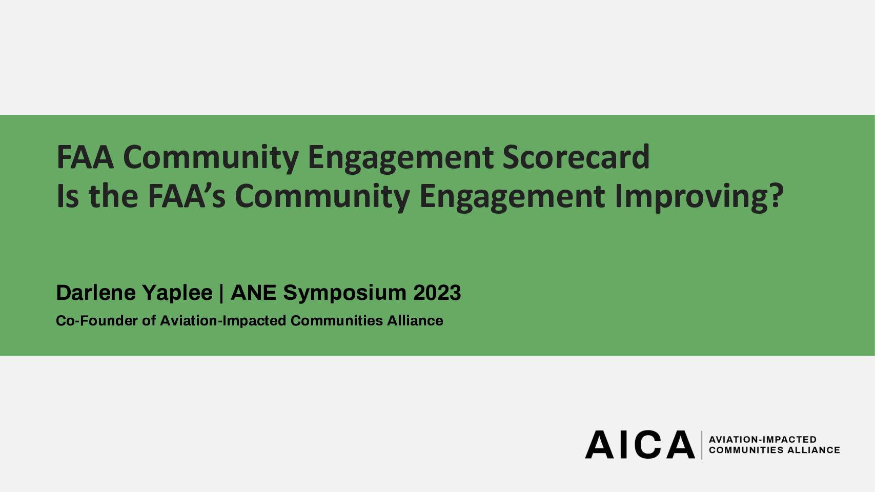 Over the last few years, the FAA has made efforts to improve its community engagement strategy by implementing tools and programs to address community engagement concerns. FAA published the Community Involvement Manual and Desk Guide and on-boarded all Chief Engagement Officers (CEO) 2019- 2020. Source: FAA (Modified) AICA FAA Community Engagement Scorecard (FAACES) • The Project Use responses on FAA’s community engagement to identify response themes and suggest recommendations • The Outcome Solicit and summarize feedback from community groups on their experience with FAA community engagement for local and national topics in 2020, 2021, and 2022 compared to pre-2020. Has there been improvement from the perspective of communities? ---Future FAACES report, link. https://aviationimpactedcommunities.org/faa-community-engagement-scorecard-faaces-may-2022-current/ Survey Context • Input via an On-line Form • Outreach to 77 Community Groups, 61% Response Rate • Outreach to communities that make up the Aviation-Impacted Communities Alliance (AICA) • One participant per community group • Engaged with the FAA during 2020-2022 • Does not include experiences with FAA community engagement before 2020 • FAA Survey Precedent • FAA Reauthorization Act of 2018 - Section 176, Community Involvement Review 2020 • Air Traffic Organization (ATO) internal survey • FAACES includes FAA Community Engagement for Local and National Topics AICA Local and National Topics 43% Local Topics Only 34% Neither Local or National Topics 21% 2% National Topics Only Responses 4AICA FAACES Survey Summation Highlights • Local topics • For example: new or changed procedures and noise complaints • National topics • For example: FAA advisory committees and… -