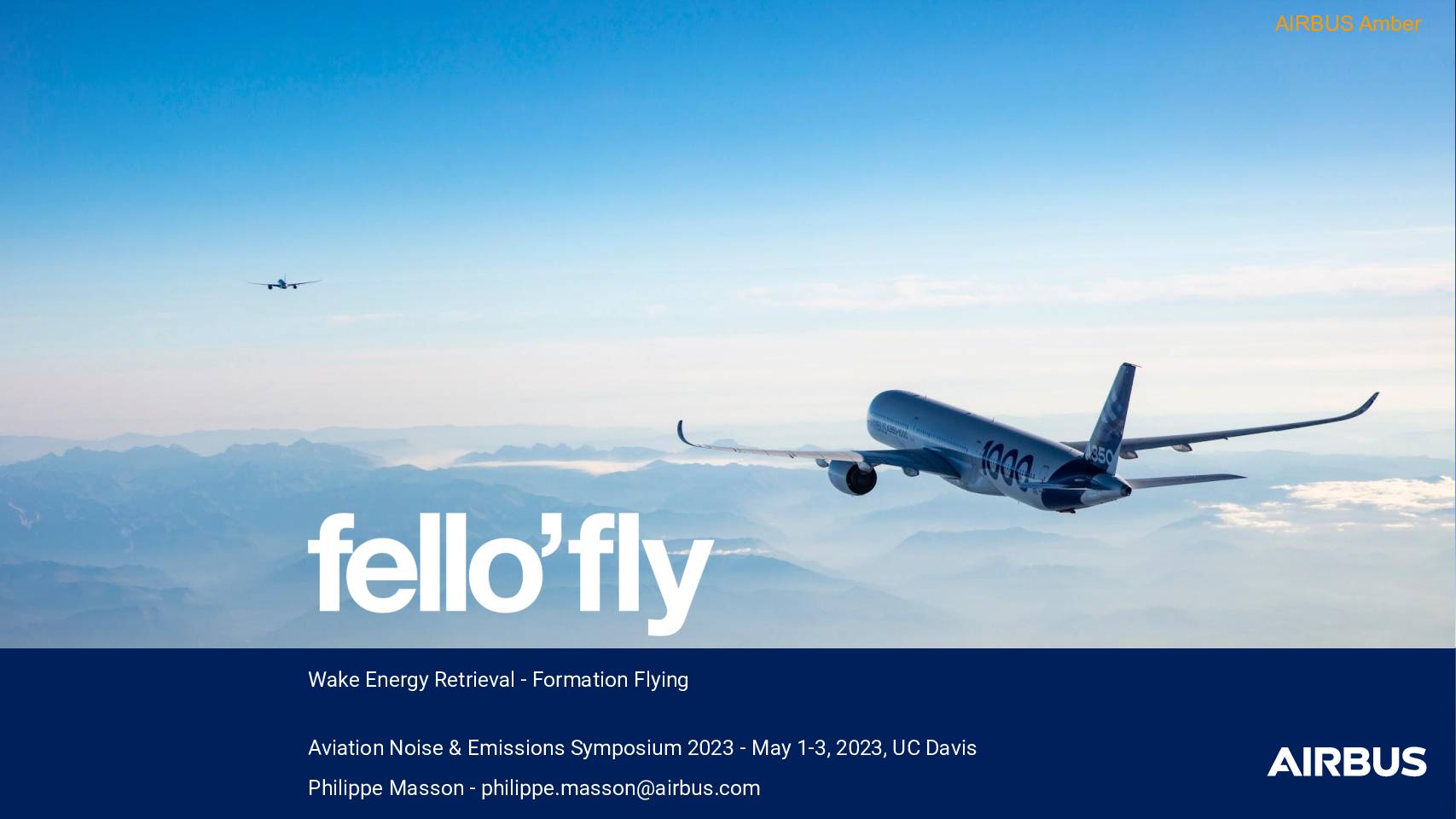 Aviation Noise & Emissions Symposium 2023 - May 1-3, 2023, UC Davis Philippe Masson - philippe.masson@airbus.com AIRBUS Amber https://anesymposium.aqrc.ucdavis.edu/ AIRBUS CONFIDENTIALAIRBUS CONFIDENTIAL Wake Energy Retrieval A large amount of kinetic energy is left behind aircraft in their wakes. Around 5% trip fuel & emissions reduction for a follower aircraft positioned in the smooth updraft Applies to sectors above 2000 NM Leader Follower Smooth updraft AIRBUS Amber AIRBUS CONFIDENTIALAIRBUS CONFIDENTIAL Wake Energy Retrieval Key parameters AIRBUS Amber AIRBUS CONFIDENTIAL Technology 5% fuel and CO2 proven savings AIRBUS Amber AIRBUS CONFIDENTIALAIRBUS CONFIDENTIAL https://docs.google.com/file/d/1FX7XxgihQQce2dzegHl2HOLP3hHsChsk/preview AIRBUS CONFIDENTIAL Initial Concept of Operations Pre-departure Post-departure pairing callout Rendez-vous Separation responsibility transfer Join-up (pre-OPTI) Join-up (OPTI) Formation Keeping Split 3 4 5 6 7 8 Oceanic CONOPS agreed with project collaborating partners AIRBUS Amber AIRBUS CONFIDENTIAL AIRBUS Amber https://docs.google.com/file/d/1wL58pkY0_demh6YnKCumZoa3m0COIukZ/preview AIRBUS CONFIDENTIAL Q&A More information : https://www.airbus.com/en/innovation/disruptive-concepts/biomimicry/fellofly AIRBUS Amber AIRBUS CONFIDENTIAL Thank you This document and all information contained herein is the sole property of Airbus. No intellectual property rights are granted by the delivery of this document or the disclosure of its content. This document shall not be reproduced or disclosed to a third party without the expressed written consent of Airbus. This document and its content shall not be used for any purpose other than that for which it is supplied. Airbus, its logo and product names are registered trademarks. © Copyright Airbus (2023 /fello’fly introduction to Aviation Noise & Emissions Symposium 2023) AIRBUS Amber https://anesymposium.aqrc.ucdavis.edu/ -