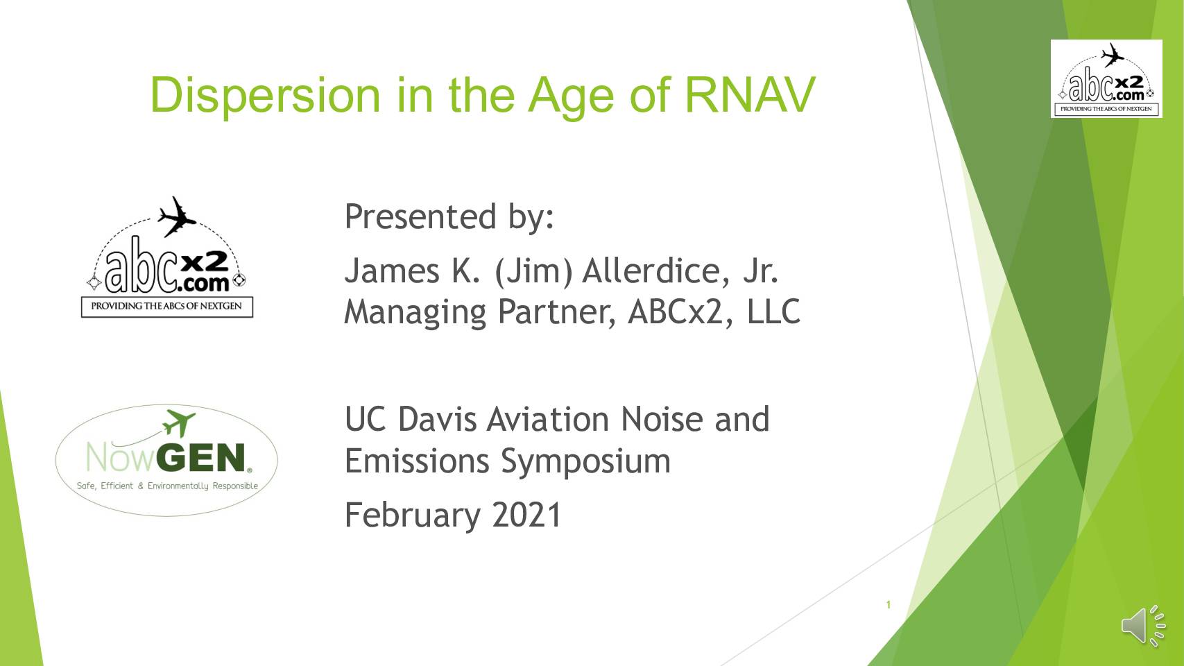 Hi! My name is Jim Allerdice. I’m the Managing Partner and Chief Consultant for Terminal Operations, for ABCx2, LLC. ABCx2 is a community focused company that provides advocacy for communities with the FAA, Airports, and the Aviation Industry at large. We provide a voice for communities and interpret the technical language of the aviation industry in such a way as to provide meaningful, measurable and implementable solutions for communities impacted by aviation noise. What is dispersion? The process of introducing track variability by changing aircraft lateral position enough to spread out repetitive and intrusive noise events experienced by people living under highly concentrated flight paths. Presenter Presentation Notes Today, I want to talk to you about dispersion. Many communities believe that noise dispersion holds the answers to the impacts felt from aircraft operations. But first, we must find a definition of dispersion. What does dispersion look like in the age of RNAV? Well, for our purposes today, dispersion is… So, how do we get to dispersion? First, we must understand why the FAA likes Performance Based Navigation, or PBN, so much. Why does the FAA like PBN so much!? Safety Communications Reduction Pilot/Controller Workload Reduction Situational Awareness Improvements Efficiency Point-to-Point Navigation ELSO – Equivalent Lateral Spacing Operations Presenter Presentation Notes Implementation of PBN has shown up to 33% reduction in voice transmissions. Workload has been Reduced for both pilots and controllers – Less manual flying for pilots, less vectoring for controllers. Situational… -