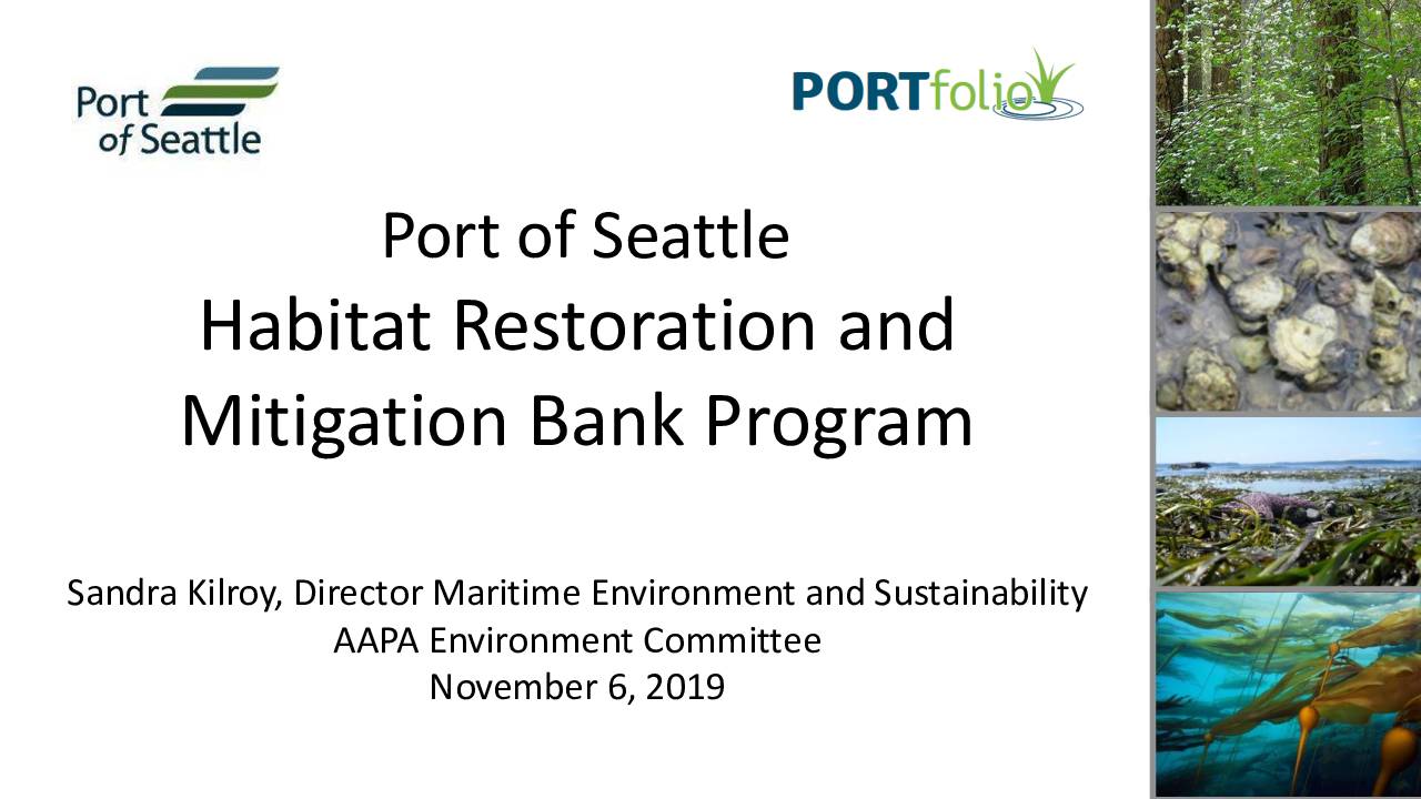 Sandra Kilroy, Director Maritime Environment and Sustainability AAPA Environment Committee November 6, 2019 Port is in unique position • Ownership of extensive shoreline in critical areas for listed species • Provide compensatory mitigation • Promotes climate adaptation & resilience • Generate revenue (mitigation banking) • Maintain social license to operate • 31 habitat sites, 21 parks, 15.4 miles of shoreline • Compensatory mitigation sites (12 acres) • Community stewardship sites (18 acres) • Multi-site mitigation bank (~75 acres) • Alternative Bankline Stabilization Program • Innovation (R&D) – Smith Cove Blue Carbon Pilot Project – Floating Wetland Islands (aka Bio-Barges) – Underwater Noise Reduction Seattle +12’ MLLW +16’ MLLW Alternative Shoreline Stabilization Program Removed structures/fill +20’ MLLW Alternative Bankline Stabilization: T-108 Pre-Project Alternative Bankline Stabilization: YEAR 1 YEAR 3 Mitigation Bank • Prospectus submitted May 2019 • Main sites @ Terminal 117, Terminal 25, Auburn • Marine, estuarine and freshwater habitat • Service area = Green-Duwamish Watershed • Mitigation market: – Wetland/stream (Section 404, Clean Water Act) – Listed species (Endangered Species Act) – Natural Resource Damages (CERCLA) – Floodplain storage (Municipal codes/FEMA) – Carbon? Mitigation Bank (cont.) • Derelict structure removal: • Terminal 5 • Pier 34 • Pier 16 • Pier 48 (w/ Washington State Ferries) • Other restoration projects • Terminal 115 • Terminal 108 • Terminal 107 • Terminal 105 Third Runway Mitigation Site (65 acres) New Mitigation Bank Site (34 acres) Multi-Site Mitigation Bank: Auburn Wetlands New Off- Channel Fish Access Area (11 acres) Multi-Site Mitigation…