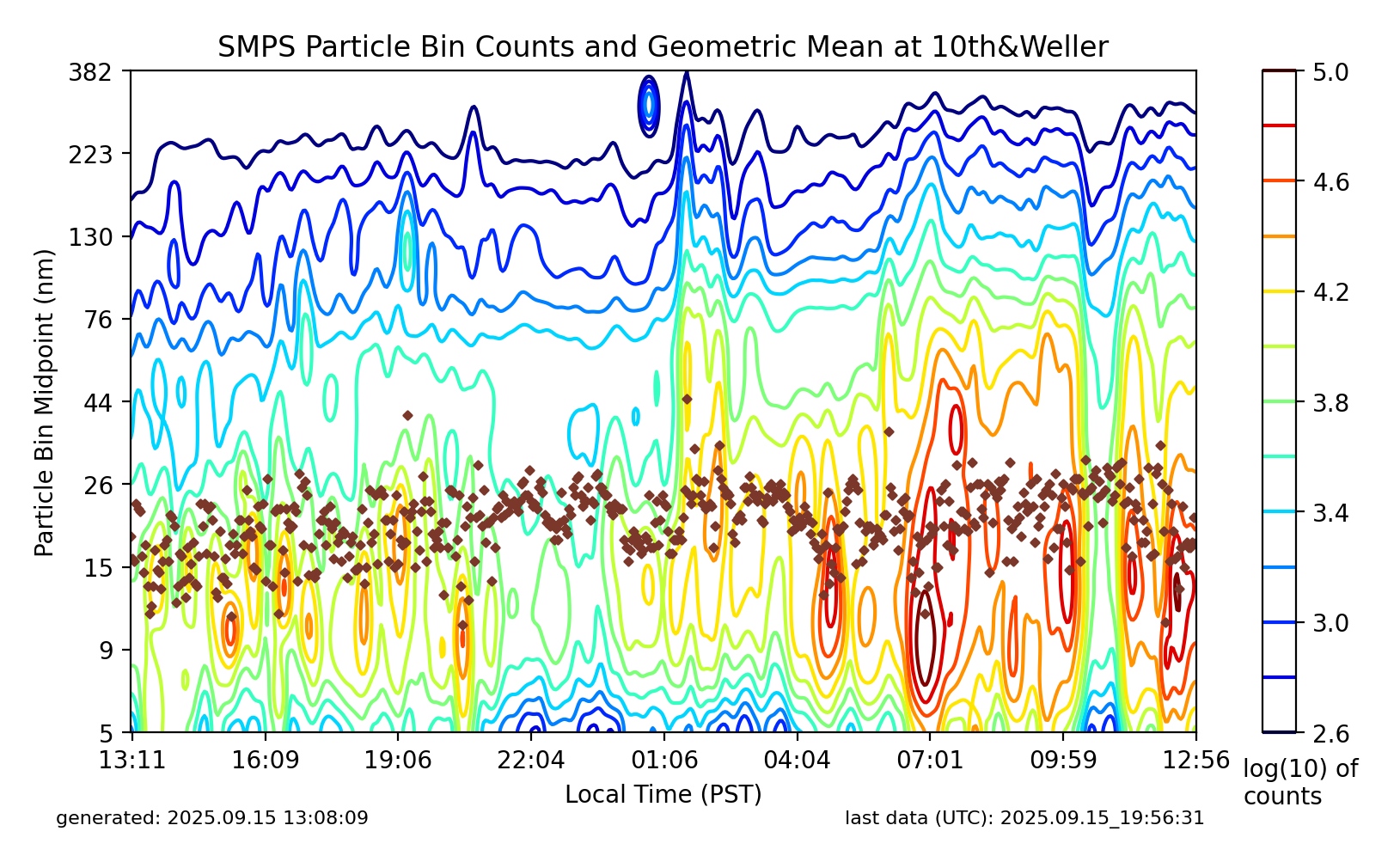 SMPS Particle Bin Counts and Geometric Mean at 10th&Weller