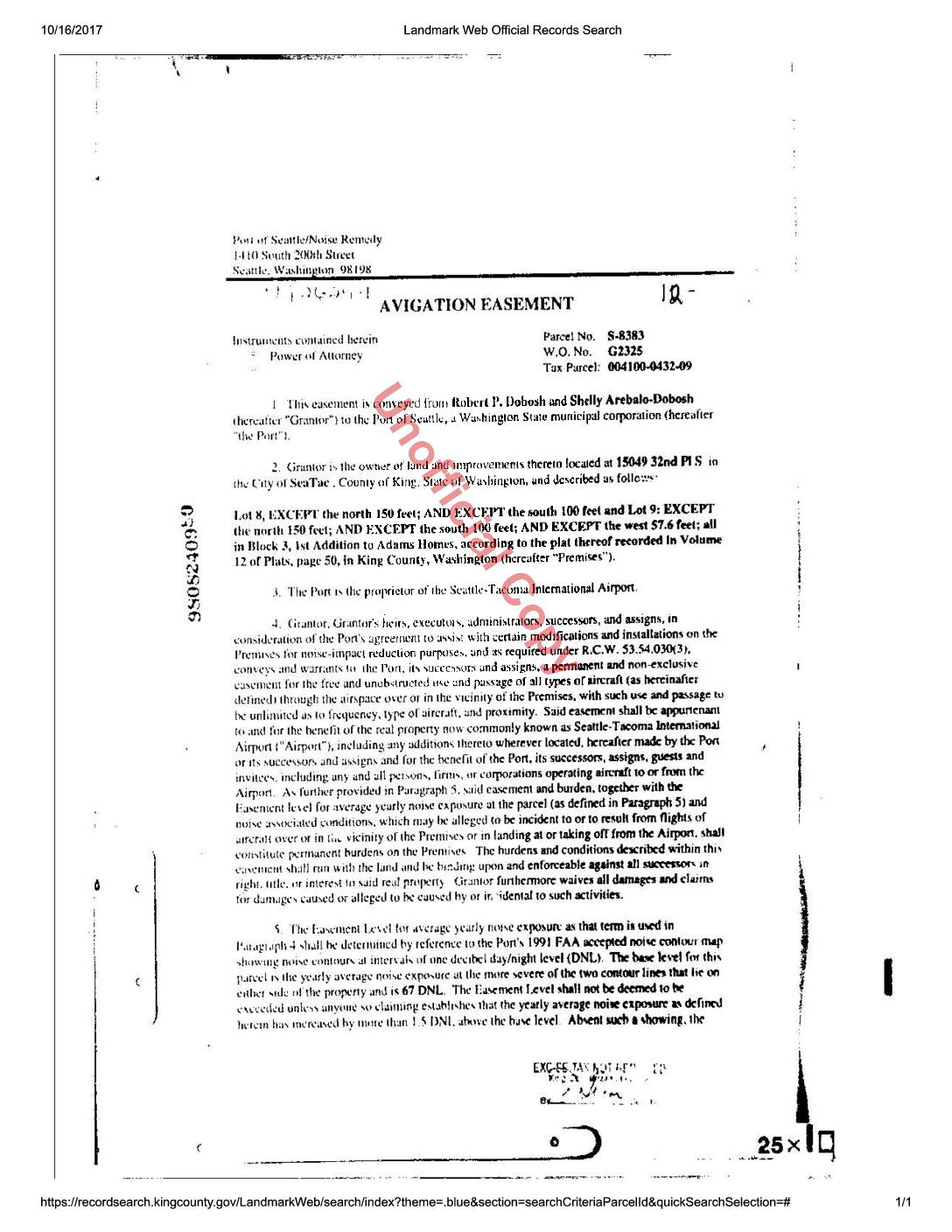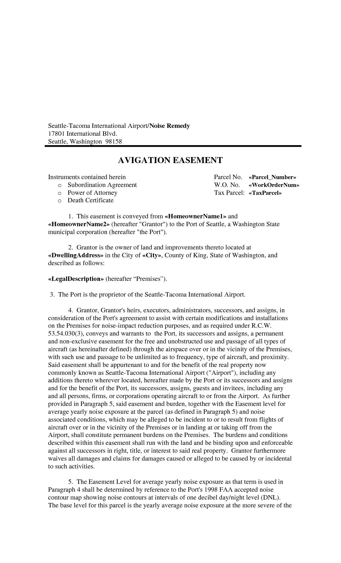 1. This easement is conveyed from «HomeownerName1» and «HomeownerName2» (hereafter "Grantor") to the Port of Seattle, a Washington State municipal corporation (hereafter "the Port"). 2. Grantor is the owner of land and improvements thereto located at «DwellingAddress» in the City of «City», County of King, State of Washington, and described as follows: «LegalDescription» (hereafter “Premises”). 3. The Port is the proprietor of the Seattle-Tacoma International Airport. 4. Grantor, Grantor's heirs, executors, administrators, successors, and assigns, in consideration of the Port's agreement to assist with certain modifications and installations on the Premises for noise-impact reduction purposes, and as required under R.C.W. 53.54.030(3), conveys and warrants to the Port, its successors and assigns, a permanent and non-exclusive easement for the free and unobstructed use and passage of all types of aircraft (as hereinafter defined) through the airspace over or in the vicinity of the Premises, with such use and passage to be unlimited as to frequency, type of aircraft, and proximity. Said easement shall be appurtenant to and for the benefit of the real property now commonly known as Seattle-Tacoma International Airport ("Airport"), including any additions thereto wherever located, hereafter made by the Port or its successors and assigns and for the benefit of the Port, its successors, assigns, guests and invitees, including any and all persons, firms, or corporations operating aircraft to or from the Airport. As further provided in Paragraph 5, said easement and burden, together with the Easement level for average yearly noise exposure at the parcel (as defined…