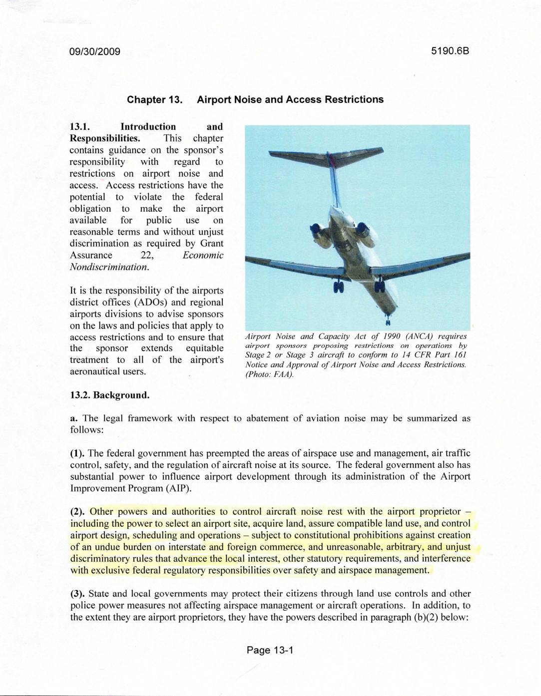 Chapter 13. Airport Noise and Access Restrictions 13.1. Introduction and Responsibilities. This chapter contains guidance on the sponsor’s responsibility with regard to restrictions on airport noise and access. Access restrictions have the potential to violate the federal obligation to make the airport available for public use on reasonable terms and without unjust discrimination as required by Grant Assurance 22, EconomIc Nondiscrimination. It is the responsibility of the airports district offices (ADOs) and regional airports divisions to advise sponsors on the laws and policies that apply to access restrictions and to ensure that the sponsor extends equitable treatment to all of the airport's aeronautical users. Airport Noise and Capacity Act of 1990 (ANCA) requires airport sponsors proposing restrictions on operations by Stage 2 or Stage 3 aircraft to conform to 14 CFR Part 161 Notice and Approval of Airport Noise and Access Restrictions. (Photo: FAA). 13.2. Background. a. The legal framework with respect to abatement of aviation noise may be summarized as follows: (1). The federal government has preempted the areas of airspace use and management, air traffic control, safety, and the regulation of aircraft noise at its source. The federal government also has substantial power to influence airport development through its administration of the Airport Improvement Program (AIP). (2). Other powers and authorities to control aircraft noise rest with the airport proprietor – including the power to select an airport site, acquire land, assure compatible land use, and control airport design, scheduling and operations – subject to constitutional prohibitions against… -