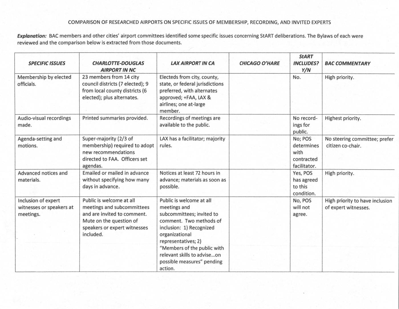 COMPARISON OF RESEARCHED AIRPORTS ON SPECIFIC ISSUES OF MEMBERSHIP, RECORDING, AND INVITED EXPERTS Explanation: BAe members and other cities’ airport committees identified some specific issues concerning StART deliberations. The Bylaws of each were reviewed and the cornparison below is extracted from those documents. // SPECIFIC ISSUES Membership by elected officials. mio-visual recordings made. Agenda-setting and motions. Advanced notices and materiats. Inclusion of expert witnesses or speakers at meetings. CHARLOTrE-DOUGLAS AIRPORT IN NC ers frorn :14 city council districts (7 elected); 9 from local county districts (6 elected); plus alternates. Printed summaries provided. Super-majority o membership) required to adopt new recommendations directed to FAA. Officers set agendas. Emailed or mailed in advance without specifying how many days in advance. Public is welcorne at all meetings and subcommittees and are invited to comment. Mute on the question of speakers or expert witnesses included. StART INCLUDES? ! BAC COMMENTARY Y/N CHICAGO O’HARELAX AIRPORT IN CA Electeds from city, county, state, or federal jurisdictions preferred, with alternates approved; +FAA, tAX & airlines; one at-large member. Recordings of meetings are avaitable to the public. Highest priority.No record- ings for public. No; POS determines with contracted facilitator. Yes, POS has agreed to this condition. No, POS will not agree . LAX has a facilitator; majority rules. No steering committee; prefer citizen co-chair. Notices at least 72 hours in advance; materials as soon as possible. High priority. Public is welcome at all meetings and subcommittees; invited to comment. Two methods of inclusion: 1) Recognized organizational representatives; 2)… -